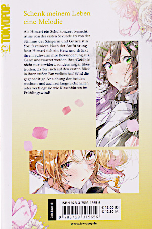 ![]() © 2019 Eku Takeshima TokyopopDie Schülerin Himari Kino ist neu in die Oberstufe gekommen. Dort trifft sie ihre Kindheitsfreundin Miki Mizuguchi, mit der sie sogar in dieselbe Klasse geht. Miki weißt Himari darauf hin, dass ihre Schwester Aki zur Ankunft der neuen Schüler mit ihrer Band „Sweet Explosion“ ein Konzert gibt. Himari, die zum ersten Mal ein Live-Konzert besucht, ist sofort verliebt. Allerdings nicht in Aki oder die Musik, sondern in die Leadsängerin Yori Asanagi. Später läuft Himari Yori über den Weg und gesteht ihr spontan, dass sie sie liebt. Von Miki erfährt Himari mehr über Yori. So ist sie eigentlich nicht die Sängerin der Band, sondern nur für diesen einen Auftritt eingesprungen. Als Himari enttäuscht reagiert, verrät ihr Miki, dass Yori nach der Schule öfters alleine auf dem Dach singt. Als Himari dort hingeht, trifft sie tatsächlich auf Yori. Diese erkennt sie wieder und ist hocherfreut. So erklärt auch Yori, dass sie Himari liebt. Nur antwortet diese, dass sie sich in die Musik verliebt hat und es schade findet, Yori nicht mehr in der Band zu hören. Yori weiß nicht, ob sie enttäuscht oder erfreut sein soll. Denn auch sie hat sich eigentlich nicht in Himari verliebt. Die anderen Band-Mitglieder hatten Yori gedrängt, sich zu verlieben, damit sie Liebeslieder schreiben könnte. Und als ihr Himari die Liebe gestand, wollte sie darauf eingehen, um sich auch zu verlieben. Aber zu ihrer eigenen Überraschung merkt Yori dann, dass sie Himari wirklich dazu bringen will, sich in sie zu verlieben. In dem Manga geht es darum, wie aus Schwärmerei Liebe wird. Aber es geht auch darum, jemanden dazu zu bringen, sich in sie zu verlieben. Für jemanden, der sich selbst noch nie verliebt hat, ist es ein schwieriges Unterfangen. Grafisch ist der Manga sehr gelungen. Die Charaktere sind gut getroffen und detailliert gezeichnet. Die Gefühle sind fein gezeichnet und so wirken die Charaktere auch sehr lebendig. Die Kleidung, hauptsächlich Schuluniformen, ist einfach, aber mit Schleifen verziert. Durch Schattierungen und Falten passt sich die Kleidung gut den Posen an. Gegenstände sind sauber und detailliert gestaltet. Die Hintergründe sind etwas einfach, aber erkennbar gestaltet. Sie passen allerdings zu den restlichen Zeichnungen. |