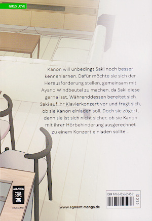 © 2021 Kuzushiro Egmont MangaDie Schülerin Saki Kindaichi fühlt sich etwas krank, dennoch geht sie, auch wenn noch Schnee liegt, zum Klavierunterricht. Dabei stößt sie aus Versehen mit einem hübschen Mädchen zusammen. Da das Mädchen Noten in der Hand hält, fragt sie es, ob sie auch Klavier spielt. Daraufhin schenkt ihr das Mädchen wortlos die Noten und verschwindet. Als kurz darauf das neue Semester in der Oberschule beginnt, sieht Saki das Mädchen aber wieder. Denn sie ist nicht nur in ihrer Klasse, sondern sogar ihre Sitznachbarin. Aber noch überraschender ist, dass ihre neue Klassenlehrerin, Satoko Sekiguchi, zu ihr an den Platz kommt. Denn sie will etwas zu dem Mädchen, das Kanon Oikawa heißt, sagen. Denn Kanon ist schwerhörig, fast taub. Sie kann zwar normal reden, denn ihre Taubheit begann erst mit fünf Jahren, aber selbst mit Hörgeräten fällt ihr das Hören schwer. Dennoch will Kanon wie eine normale Schülerin behandelt werden. Sie hat gelernt, von den Lippen abzulesen und wenn es still ist, versteht sie auch etwas von dem, was ihr Gegenüber sagt. Schwierig wird es für sie, wenn viele Leute durcheinander reden. Aber deswegen grenzt sich Kanon auch von den anderen Schülern ab. Auch wenn Frau Sekiguchi Saki gebeten hat, auf sie aufzupassen, stößt Kanon sie weg, denn sie will kein Mitleid. Von den anderen Schülerinnen hört Saki, dass Kanon in der Mittelschule wegen ihrem Verhalten gemobbt worden ist. Auch hier mögen sie Kanons Verhalten nicht. Saki kennt nun beide Seiten, will aber eher Kanon helfen. Als die Schule aus ist, regnet es allerdings. Saki sieht Kanon am Eingang stehen und stellt sich zu ihr. Aber Kanon schickt sie mürrisch weg. Dennoch hat Saki einen Geistesblitz. So läuft sie los und kauft in einem nahen Laden einen Regenschirm. Denn sie geht davon aus, dass Kanon wegen ihrer Hörgeräte nicht im Regen laufen will. Leider wird Saki dabei ganz nass, denn sie hat vor lauter Aufregung vergessen, dass sie zumindest auf dem Rückweg vom Laden ja den Schirm dabei hat. Als Kanon sie deswegen ausschimpft, meint Saki aber nur, dass es halt ihre persönliche Behinderung ist, ein wenig dumm zu sein. Daraufhin sieht sie Kanon zum ersten Mal lachen. Durch dieses Ereignis ist das Eis zwischen Saki und Kanon gebrochen und sie verstehen sich besser. Auch wenn Kanons Verhalten für Saki teilweise immer noch befremdlich wirkt. Aber immerhin darf sie Kanon nun fragen, ohne gleich eine harsche Antwort zu bekommen. So geht es in dem Manga um die Beziehungen zweier Schülerinnen zueinander. Weil Kanon fast taub ist, hat sie sich sehr zurückgezogen. So will Saki nicht nur mit Kanon befreundet sein, sondern sie soll sich auch mit anderen Mädchen der Klasse anfreunden. Grafisch ist der Manga sehr gelungen. Trotz einer großen Anzahl an Schülerinnen sind die Charaktere auch in den Nebenrollen unterschiedlich gestaltet. Wobei Charaktere, die nicht im Fokus der Geschichte stehen, auch gesichtslos dargestellt werden können.Die Frisuren sind abwechslungsreich. Die Gesichter ähneln sich zwar etwas, sind aber so fein gezeichnet, dass sie die Gefühle der Schülerinnen gut zeigen können. Als Schülerinnen tragen die Charaktere hauptsächlich ihre Schuluniformen, die etwas einfach gestaltet ist. Doch durch Falten und Schattierungen passen sie sich gut der Körperhaltung und den Bewegungen der Mädchen an. Gegenstände werden einfach, aber gut erkennbar dargestellt. Auch die Hintergründe sind etwas einfach, aber dennoch sehr detailreich gezeichnet. |