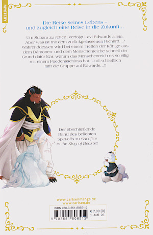 © 2023 Yu Tomofuji Carlsen VerlagDiese Serie spielt 12 Jahre nach „Sacrifice to the King of Beasts“. Seine Majestät Leonheart will dass das Dämonenreich Ozmargo sich dem Menschenreich Yoana annähert. So ist das Verbot, die Grenze zu überschreiten, gestrichen worden. Es soll auch keine weiteren Opfergaben geben. Nun feiert Prinz Richard, der Sohn von Leonheart und Salphie, demnächst seinen zehnten Geburtstag. An diesem Tag soll er als Sohn des Königs sein Heiliges Tier empfangen. Die Menschen wollen zu diesem Anlass eine Delegation schicken, um zu sehen, welches Tier Richard erhält. Denn das Tier spiegelt die innere Einstellung des Beschwörers wieder. Und nur wenn das Tier gutmütig ist, wollen sie den Friedensvertrag mit den Dämonen unterschreiben. So hängt viel davon ab, welches Tier Prinz Richard bekommt. Leider ist der Druck auf Richard sehr groß. So groß, dass er aus dem Palast flieht, um alleine seine Erfahrungen zu machen. Auf seiner Flucht trifft er auf die beiden Kopfgeldjäger Lavi und Subaru. An der Grenze zwischen den Ländern ist der Einfluss der beiden Regierungen gering, so dass hier Kriminelle leben. Und sie nutzen die Grenze, um zu fliehen. Der Weisshase Lavi und die Menschenfrau Subaru leben von der Jagt auf diese Verbrecher. Richard beschließt den beiden zu folgen, um ein besserer Dämon zu werden. Glücklicherweise ist Subaru ganz vernarrt in ihn. Und auch wenn Lavi etwas mürrisch ist, willigt er ein. Als Richard aber erfährt, dass Lavi einen Groll auf das Königshaus hegt, nennt er sich Rion. Allerdings sieht sich Lavi nicht als guter Lehrer für Richard. Denn er hat mit seinen eigenen Sorgen zu kämpfen. Am nächsten Morgen kommt Subaru mit Nachrichten aus dem nächsten Dorf. Sie haben zwar einen Verbrecher gefangen, aber dessen Boss konnte entkommen. Und dieser Boss nimmt ausgerechnet Richard als Geisel. Der Manga ist die humoristische Fortsetzung der alten Serie. Dieses Mal geht es um das Kind von Leonheart und Salphie. Durch ihn lernt man die Welt des Dämonenreiches und das Leben der einfachen Dämonen außerhalb des Königshauses kennen. Auch Richard muss das Leben kennenlernen und lernen, wie man gut und böse unterscheidet. Grafisch ist der Manga sehr gelungen. Die Charaktere sind abwechslungsreich gestaltet und sauber gezeichnet. Man kann bei den Tieren leicht die Vorbilder erkennen. Die felligen Gesichter sind gut getroffen. Die Emotionen sind teilweise etwas übertrieben und daher leicht erkennbar. Die Kleidung ist unterschiedlich, passt aber gut zu dem Rollen, die die Charaktere verkörpern. Die Bewegungen sind recht dynamisch dargestellt. Die Kämpfe dauern aber meistens nicht so lang. Teilweise sind sie etwas blutig, aber ohne in den Splatter abzugleiten. Gegenstände sind sehr sauber gestaltet. Die Hintergründe wirken etwas eintönig, sind aber meistens dennoch sehr sauber umgesetzt. |