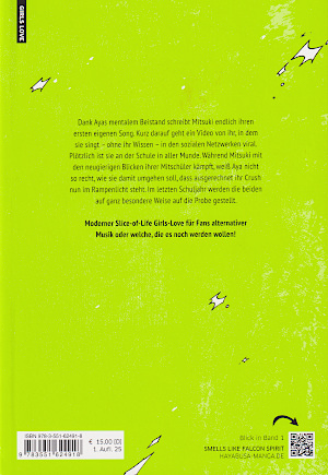 © 2023 Sumiko Arai HayabusaDer Musikgeschmack der Schülerin Aya Osawa ist etwas eigen, sie steht auf Rockbands wie die Foo-Fighters. So hat sie zwar in der Schule eine Clique, aber sie kann mit ihnen nicht über die Musik reden. Eines Tages entdeckt Aya auf dem Weg nach Hause einen kleinen Plattenladen, der sich genau auf die Musik spezialisiert hat, die sie mag. Dazu kommt, dass der Verkäufer für Aya eine unwiderstehliche Aura ausstrahlt. Gleich am nächsten Tag berichtet Aya in der Schule ihrer Clique, dass sie nicht nur den tollen Plattenladen mit ihrer Musik gefunden hat, sondern dass sie sich anscheinend auch in den Verkäufer verknallt hat. Aya ahnt aber nicht, dass der Verkäufer eigentlich ihre etwas schüchterne Mitschülerin Misuki Koga, die ihr Gesicht hinter einer Atemschutzmaske und die Haare unter einer Kapuze versteckt hat. Sie hilft im Laden auch nur ihrem Onkel Joe aus. So hört Misuki jedes Wort, dass Aya spricht. Und da es in der Schule zu öffentlich ist, beschließt sie, Aya bei ihrem nächsten Besuch im Laden über sich aufzuklären. Aber als Aya das nächste Mal in den Laden kommt, überrascht sie Misuki unvorbereitet. Anstatt ihr ihre Identität zu sagen, beginnt sie damit, über die Musik zu reden, die sie beide mögen. Und am Ende leiht sie ihr noch eine CD mit ihrer Musik aus. Misuki fragt sich, wohin das Ganze noch führen soll. Aber da Aya so gestrahlt hat, konnte sie sich nicht überwinden, ihr die Illusion zu rauben. Ihr Onkel Joe ist allerdings glücklich, dass mit Aya endlich mal wieder ein jüngerer Mensch in seinen Laden gekommen ist. Auch wenn er sich fragt, wie tief die Beziehung zwischen Aya und Misuki ist. Tatsächlich fühlt sich Misuki immer etwas schlechter. Sie freut sich zwar, wenn sie Aya sieht, aber sie bekommt auch immer mehr Angst vor dem Augenblick, in dem Aya ihre wahre Identität erfährt. Und es hilft Misuki kaum, dass der Klassenkamerad Narita sie durchschaut und beschließt, ihr zu helfen. In dem Manga geht es um zwei Schülerinnen, die zufällig aufeinander treffen. Sie eint die Liebe zur Hardrock-Musik. Aber weil Misuki etwas zu lange zögert, Aya ihre Identität zu zeigen, verpassen sie den Zeitpunkt, um ihr Leben normal weiter zu leben. Grafisch ist der Manga sehr gut. Die Charaktere sind sehr detailliert und sauber gezeichnet. Etwas gewöhnungsbedürftig ist der grüne Hintergrund. Da die Charaktere aber in schwarzweiß gezeichnet sind, werden sie besonders hervorgehoben. Die langen Haare sind sehr detailliert mit Strähnen, die ihn ständig ins Gesicht hängen. Die Gesichter sind gut getroffen, die ordentlich die Gefühle darstellen. Die Verwandlung von Misuki in den Verkäufer ist überzeugend. Die Kleidung, passende Freizeitkleidung, ist sauber umgesetzt, mit vielen Falten, die die Kleidung plastisch wirken lässt. Gegenstände wie Musikinstrumente, Schmuck oder Kopfhörer sind sehr sauber und detailreich gezeichnet. Es gibt nur wenige Hintergründe, die wenig detailliert sind. Wegen der grünen Farbe fällt es aber auch nicht so stark auf. |