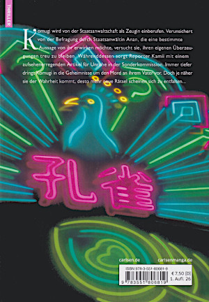 © 2022 Rito Asami Carlsen VerlagDie junge Studentin Komugi Yamashita wohnt immer noch bei ihrem Vater Haruo, einem ehemaligen Polizeibeamten. Allerdings sehen sie sich meistens nur, wenn sie bei Herrn Someda Ramen essen. Eines Tages geht Komugi nach dem Essen noch ins Kino, während ihr Vater zu Hause bleibt. Als sie nach Hause kommt, brennt ihre Wohnung und ihr Vater wurde ermordet. Kommissar Akazawa fast den Täter allerdings schnell. Es ist Tomoya Endo, der Sohn von Rikiro Endo, der vor einigen Jahren die Familie Hayashikawa ermordet hat. Komugis Vater hat damals in dem Fall ermittelt und Tomoya Endo lebt in der Nähe von ihr. Als Komugi nach dem Trubel um die Beerdigung und dem Suchen einer neuen Wohnung wieder bei Herrn Someda Ramen essen geht, gibt der ihr einen dicken Umschlag mit viel Geld. Er erzählt ihr, dass ihr Vater diesen Brief bei ihm an dem Tag geschrieben hat, an dem er ermordet worden ist. In dem Brief steht zu Komugis Erstaunen, dass ihr Vater ahnt, ermordet zu werden. Und er zählt eine Liste an Leuten auf, von denen er befürchtet, dass einer von ihnen zu Unrecht an dem Mord an ihm beschuldigt werden könnte. Das Geld in dem Brief ist in dem Fall für einen Rechtsanwalt, der den Täter verteidigen soll. Und zu Komugis Überraschung steht auch Tomoya Endo auf der Liste. Komugi geht zu Yoshiteru Matsukaze, wie es ihr Vater sich gewünscht hat und in der Hoffnung, mehr über den Brief zu erfahren. Doch zu ihrer Überraschung gibt der vor, ihren Vater nicht zu kennen. Er will sich auch nicht von ihr engagieren lassen, weil er vermutet, dass sie eventuell nur darauf aus ist, Tomoya Endo so zu schaden. Empört und ratlos verlässt ihn Komugi wieder. So versucht Komugi selbst zu ermitteln, auch wenn es schwer fällt. Bei der Polizei schreckt sie aber davor zurück, Kommissar Akazawa von dem Brief zu erzählen. Dafür lernt sie Takashi Kamii kennen, einen Journalisten, der sich für seinen Fall interessiert. Und auch Herr Matsukaze meldet sich wieder. Der Manga erzählt einen Krimi, bei dem der ermittelte Täter nicht der wirkliche Täter zu sein scheint. Und Komugi erkennt, dass ihr Vater auch seine Geheimnisse zu haben scheint. Auf ihn bezieht sich der Pfau im Titel. Denn anscheinend hat er getanzt, aber niemand, nicht einmal Komugi, hat ihm richtig dabei zugesehen. Und wer kann dann schon sagen, dass er getanzt hat? Grafisch ist der Manga in Ordnung. Die Charaktere sind zwar etwas unsauber, aber unterschiedlich gestaltet. Die Frisuren und auch die Gesichter sind abwechslungsreich gezeichnet. Auffällig sind nur Komugis große Augen. Die Gefühle der Charaktere werden dabei gut dargestellt. Die Kleidung ist eher einfach gestaltet. Aber die unterschiedlichen Posen werden durch sie gut unterstützt. Gegenstände wie Handys oder Lebensmittel sind sauber gezeichnet. Polizeibilder vom Mord an der Familie Hayashikawa sind zwar zensiert, wirken aber dennoch brutal. Die Hintergründe sind sauber und detailreich gestaltet. |