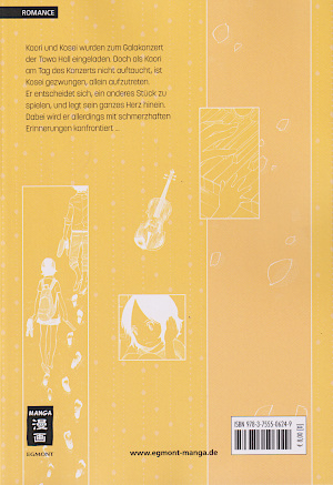 ![]() © 2011 Naoshi Arakawa Egmont MangaDie Mutter des als Wunderkind gefeierten Kosei Arima starb, als er 11 Jahre alt war. Da sie es war, die ihn zum Klavier spielen trieb, hatte er danach Probleme mit seinem Klavierspiel, weswegen er komplett damit aufgehört hat. Koseis einziger Halt ist seine Sandkastenfreundin Tsubaki aus dem Nachbarhaus. Sie unterstützt ihn, auch wenn ihre Bälle aus dem Sportunterricht oft den Weg an seinen Kopf fanden. Aber seit er sie getroffen hat, spürte er das erste Mal nach dem Tod seiner Mutter wieder etwas Farbe in sein Leben. Eines Tages schlägt Tsubaki aber ein gemeinsames Treffen mit Ryota Watari vor. Ryota ist ein Frauenheld und Tsubaki soll ihm ihre Klassenkameradin Kaori Miyazono vorstellen. Damit Tsubaki dann nicht alleine ist, soll Kosei sie begleiten. Außerdem spielt die Klassenkameradin Geige und da er Klavier spielt, sollte er sich gut mit ihr verstehen. Als Kosei allerdings am nächsten zum Treffpunkt kommt, ist noch niemand da. Da fällt ihm ein Frauenschuh im Gebüsch auf und als er weiter nachschaut, findet er nicht nur den zweiten Schuh, sondern auch eine Frauenleggings. Kurz darauf sieht er ein junges Mädchen auf dem Spielplatz, dass eine Melodica spielt. Sie tanzt dazu mit nackten Beinen auf einer Spielhöhle. Kosei ist hingerissen von ihr. Er will sie fotografieren, zumal sie zusammen mit anderen Kindern musiziert. Doch als sie stürzt, wird sein Foto etwas peinlich. Aber auch wenn Kosei sich so in Kaori verliebt hat und Kaori ihn toll findet, da er Klavier spielt, scheint sie Ryota mehr zu mögen. Aber das Treffen dauert auch nur kurz, da sie in der nahen Towa Hall einen Auftritt als Violinisten hat. Als sie in der Halle eintreffen, wird Kosei aber als das Wunderkind erkannt, der er einmal war. In dem Manga geht es um eine etwas verwirrende Liebesgeschichte zwischen einer Violinisten und einem Klavierspieler. Aber Kaori muss ihm erst die Liebe zur Musik wieder beibringen, denn Kosei kann sein eigenes Klavierspiel nicht mehr hören. Grafisch ist der Manga sehr gelungen. Die Charaktere sind teilweise etwas schräg, aber dennoch sauber und abwechslungsreich gezeichnet. Die Frisuren sind gut getroffen und unterschiedlich dargestellt. Die Gesichter sind allerdings teilweise einfach gestaltet. Aber teilweise sind sie auch sehr fein gezeichnet und können gut die Gefühle darstellen. Als Kleidung tragen die Charaktere oft die Schuluniformen. Aber auch andere Freizeitkleidung wird getragen. Sie passt mit den Falten gut zu den Posen und dynamischen Bewegungen der Charaktere. Gegenstände wie die Musikinstrumente sind sehr sauber und ordentlich gezeichnet. Tiere hingegen sind einfach gestaltet. Die Hintergründe sind wiederum detailreich und sauber dargestellt. |