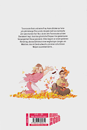 Inhalt vom Verlag: Toranosuke Ibuki und seine Frau Kaoru blicken auf eine jahrzehntelange Ehe zurück, die jede noch so stürmische Zeit überstanden hat. Nun, da der alte Toranosuke auf dem Sterbebett liegt, lässt das glückliche Ehepaar ihre gemeinsame Vergangenheit Revue passieren. Alles begann an einem goldenen Herbsttag, als das Schicksal einen waghalsigen Jungen, ein Mädchen, das im Elend aufwuchs und einen schutzlosen Welpen zusammenführte … (© Manga Cult) |