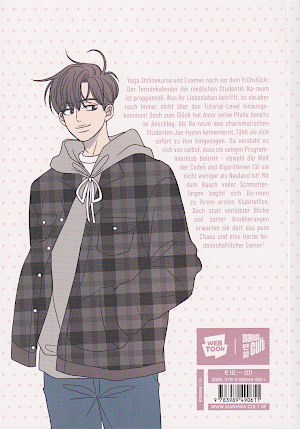 ![]() © 2019 Namsoo Manhwa CultDas Leben der Studentin Jeong Ba-reum ist bis auf die Minute durchgeplant. Sie hat immer nur ein paar Minuten Spielraum zwischen ihren Terminen. Diese benutzt sie, um für einen Englischtest zu lernen oder schnell etwas zu essen. Allerdings stellt sie fest, dass sie dabei kaum Zeit für die Liebe findet. Sie sieht überall Pärchen und hofft, dass sie eines Tages auch angesprochen wird. Denn Zeit für eine Suche hat sie kaum in ihrem Zeitplan. Abends will Jeong Ba-reum mit ihrer besten Freundin Do-eun ins Kino gehen. Doch das geht beinahe schief, da Do-euns will, dass sie die letzte Schicht in dem Café übernimmt. Glücklicherweise sieht ihr Kollege Shin Jae-hyeon ihre Notlage und erklärt sich bereit, die Schicht zu übernehmen. Allerdings muss Do-eun dennoch zwei Stunden arbeiten. Während Jeong Ba-reum auf sie wartet, sitzt sie zusammen bei Shin Jae-hyeon im Café. Weil sie viel lernt, spendiert er sogar einen Kuchen. Und als sie mit Do-eun geht, bekommt sie von ihr seine Telefonnummer zugesteckt. Jeong Ba-reum ist begeistert und als sie hört, dass Shin Jae-hyeon in einem Programmierclub ist, will sie dem Club sofort beitreten. Allerdings entpuppt sich der Club, als sie ihn am nächsten Tag aufsucht, als chaotischer Raum voller Computerspieler. Eigentlich hat Jeong Ba-reum nichts mit Computerspielen zu tun. Aber da ihr Shin Jae-hyeon versichert, dass auch Programmiert wird, beschließt sie ihm zuliebe im Club zu bleiben. Der Manhwa erzählt die Liebesgeschichte zweier unterschiedlicher Studenten. Ihre Beziehung zueinander gerät allerdings in Gefahr, als sie sein kleines Geheimnis kennen lernt. Grafisch ist der Manhwa sehr einfach. Die Charaktere sind detailarm mit großen Augen gestaltet. Die Frisuren sind unterschiedlich in verschiedenen Farben gezeichnet. In den Gesichtern fallen die Augen auf, die teilweise sehr groß oder unförmig dargestellt werden. Die Gefühle sind übertrieben und einfach gezeichnet. Zum Teil träumt sich Jeong Ba-reum in fremde Rollen. Als Kleidung tragen die Charaktere einfache Sweatshirts und Hemden. Sie sind nur leicht gemustert und einfach umgesetzt. Gegenstände sind einfach, aber erkennbar gezeichnet. Auch die wenigen Hintergründe sind detailarm umgesetzt. |