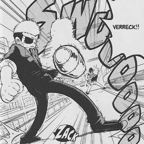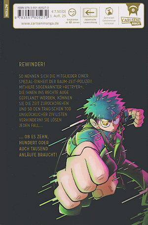 ![]() © 2022 Futa Kimura Carlsen VerlagDer junge Chrono ist neu bei der Spezialeinheit „Rewinder“ der Polizei. Diese bekommen einen sogenannten „Retryer“ in das rechte Auge eingepflanzt und können damit in der Zeit zurückspringen. So sollen sie das Leben unschuldiger Geiseln retten. Als Neuling wird Chrono dabei von dem kleinen fliegenden Computer Smarty unterstützt. In seinem aktuellen Fall soll Chrono verhindern, dass ein Supermarkträuber bei seinem Überfall die Betreiberin Frau Kawata tötet. Leider ist der Räuber ein ehemaliger Elitesoldat, der das Leben der Leute mit einer Pistole bedroht. So gehen die ersten Befreiungsversuche von Chrono fehl. Aber solange er nicht stirbt, kann er immer wieder in der Zeit zurückreisen, um einen neuen Versuch zu starten. Schließlich lässt er den Räuber sogar auf sich schießen, damit der alle Kugeln seiner Waffe verbraucht. Bei jedem neuen Anlauf weiß Chrono, wie er den Kugeln ausweichen muss. Am Ende hat der Räuber zwar keine Kugeln mehr in der Waffe, aber Frau Kawata ist so erschöpft und verängstigt, dass Chrono ihr diese Lösung nicht antun will. Erst als sein Blick auf die Comicmagazine im Ständer fällt, kommt Chrono die rettende Idee. In seinem zweiter Fall muss Chrono die verwöhnte Millionärstochter Fräulein Rei von einer einsamen Insel retten. Vor der schwierigen Rettung muss er aber mehrfach zurückspringen, weil er sich ihr behutsam nähern und erst noch Wasser und passende Nahrung für sie finden muss. Aber dann sind da noch der große Hai und der Felsen im Wasser. In dem Manga sind die unterschiedlichen Fälle von Chrono aufgelistet. Es gilt immer, Menschenleben zu retten. Dafür darf Chrono so oft in die Vergangenheit reisen, wie es benötigt. Dabei stellt er immer wieder verschiedene Szenarien auf, in der Hoffnung, so seine Mission zu erfüllen. Da er Zeit hat, testet er verschiedene Möglichkeiten, auch wenn sie wahrscheinlich scheitern. Da er in der Zeit zurückreist, sind nach jedem Sprung seine Klienten und er wieder geheilt. Grafisch ist der Manga eher durchschnittlich. Die Charaktere sind einfach gezeichnet. Die Frisuren sind unterschiedlich und passen zu den Charakteren, zeigen aber nur wenig Details. Abgesehen von älteren Leuten ähneln sich die Gesichter, wobei die Emotionen nur stark übertrieben dargestellt werden. Auch die Kleidung ist eher einfach gestaltet. Chrono trägt hauptsächlich einen schwarzen Anzug mit wenigen Konturen. Auch andere Kleidung, Uniformen oder Freizeitkleidung werden nur wenig detailliert dargestellt. Die Tiere wie Hunde, Haie oder Delfine sind gut erkennbar, wobei sie aber auch sehr kindgerecht gezeichnet sind. Auch die Gegenstände wie Waffen sind auch erkennbar umgesetzt. Die Hintergründe sind sauber und detailliert gezeichnet. |