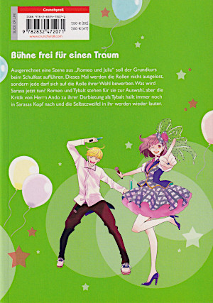 © 2016 Kumiko Saiki CrunchyrollSarasa Watanabe und Ai Narata gehören zum 100. Jahrgang des ehrwürdigen Kouka-Konservatorium. An der Theaterschule dürfen nur Mädchen lernen. So müssen bei den Aufführungen der Schule die Männerrollen auch von Frauen gespielt werden. Seit dem Semesterbeginn ist etwas Zeit vergangen. Die Schülerinnen diskutieren über ein Theaterstück, dass sie am letzten Abend besucht haben. Da kommt Sarasa eine Idee. Da Ai sie schon lange genug kennt, befürchtet sie, dass Sarasa sich wieder mal blamiert. Tatsächlich fragt Sarasa den Lehrer Herr Ando, ob sie nicht praktische Übungen machen könnten. Denn bislang durften sie nur theoretische Grundlagen lernen. Herr Ando meint aber, das die Theorie nötigt ist, um schauspielern zu können. So soll Sarasa das praktisch Umsetzen, was gerade im Unterricht gelehrt worden ist. Als Herr Ando daraufhin mit seinem Unterricht weiter macht, finden die meisten Schülerinnen Sarasa peinlich. Ai überlegt allerdings, ob Sarasa nicht einfach nur mehr drauf hat als die anderen Schülerinnen. Abends liegt ein anonymes Paket für Sarasa bereit. Es enthält 16 Rosen. Sie erklärt, dass sie am nächsten Tag Geburtstag hat. Einige Schülerinnen überlegen, ob sie die Rosen sich selbst geschickt hat. Denn Sarasa gibt auch im Internet einen Account als Freund aus, der als Bot gekennzeichnet ist. Tatsächlich steckt Akiya Shirakawa hinter dem Account. Er ist ein Erbe einer bekannten Schauspielerfamilie. Die Rosen stammen allerdings von dessen Bruder Kozaburo. Der Manga handelt von einer Klasse von Schülerinnen einer Theaterschule. In ihr ragt die Schülerin Sarasa heraus. Und das nicht nur, weil sie sehr groß ist, sondern weil sie neugierig überall nachschaut und Fragen stellt. Grafisch ist der Manga gelungen. Die Charaktere sind gut getroffen und abwechslungsreich gezeichnet. Während die meisten Mädchen normale Frisuren tragen, hebt sich Sarasa mit ihren beiden Zöpfen aus der Masse ab. Die Gesichter sind allerdings einfach und die Gefühle etwas übertrieben dargestellt. Bei älteren Menschen sind die Gesichter aber durch Brillen, Bärte und vor allem die Falten sauber und detailreich umgesetzt. Abgesehen von aufwendigen Kostümen tragen die Charaktere hauptsächlich ihre Schuluniformen oder, als Lehrer, Anzüge. Diese sind aber sehr schlicht gehalten und zeigen nur wenige Konturen. Die Schauspielerei wird neben Kostümen auch durch große Gesten dargestellt. Gegenstände wie Blumen oder Schmuck sind sauber und detailreich gezeichnet. Auch die Hintergründe werden detailliert dargestellt. |