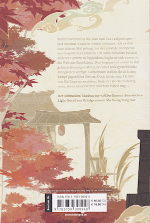 ![]() © 2024 STARember / White Dream Society Mo Xiang Tong Xiu TokyopopDer junge Gott Xie Lian ist zum dritten Male aufgestiegen. Wie alle Aufstiege vorher war auch dieser Aufstieg mit viel Getöse verbunden. Paläste gerieten in Brand oder stürzten gleich in sich zusammen. Die Beamtin Lingwen, die Xie Lian empfängt, erklärt ihm, dass er durch seinen Auftritt den anderen Göttern 8.880.000 Tugendpunkte schuldet. Ein Vielfaches von dem, das Xie Lian besitzt. Damit Xie Lian seine Schulden bezahlen kann, schlägt ihm Lingwen eine Mission vor. Die Götter bekommen in der letzten Zeit viele Gebete aus dem Norden. Dort soll sich ein böser Geist herumtreiben. Und Xie Lian soll sich dorthin begeben, um den Geist zu bekämpfen. So kommt es, dass Xie Lian kurz darauf bei dem Yujun-Berg ankommt, in dessen Nähe ständig Personen verschwinden. Aber Lingwen schickt ihm die beiden junge Beamte Fu Yao und Nan Feng zu Hilfe. Xie Lian erfährt, dass in der Gegend um den Yujun-Berg ein Geisterbräutigam leben soll. Der soll in den letzten 200 Jahren mehrere Bräute entführt haben, die für immer verschwunden blieben. Während sie ein Nachtlager suchen, begegnen Xie Lian und seine Helfer einem Zug, mit dem eine Braut herumzieht. Doch das Mädchen Xiao Ying stört sie, weil sie die Braut warnen will. Diese entpuppt sich allerdings als eine Puppe. Der Herumtreiber Xiao Pengtou und seine Bande wollten dem Geist eine Falle stellen, um die ausgesetzte Belohnung zu kassieren. Doch das bringt Xie Lian auf die Idee, zusammen mit Fu Yao und Nan Feng als Dienstmägde dem Geist eine Falle zu stellen. Der Manhua erzählt von einem Gott, der einen alten, bösen Geist jagt. Um ihn zu fangen und auch das entführte Mädchen zu befreien, will er sich selber in die Hände des Geistes begeben. In dieser Serie wird allerdings der Anime zu dem Manhua nacherzählt. Grafisch ist der Manhua gelungen. Die Charaktere sind als Animecharaktere sehr sauber gezeichnet. Die Frisuren und Gesichter sind detailreich und unterschiedlich gestaltet. So können sie ihre Gefühle auch gut zeigen. Die Kleidung ist größtenteils die einfache Kleidung der einfachen Leute auf dem Lande mit Leder und einfachen Stoffe. In der Götterwelt tragen die Charaktere aber aufwendigere Kleider mit durchsichtigen Schleiern. Gegenstände wie Waffen oder Geschirr sind sauber und detailliert gezeichnet. Auch die Hintergründe sind detailreich umgesetzt. |