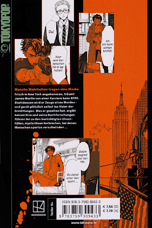 ![]() © 2023 Sora Daichi TokyopopJames Martin ist ein frischgebackener Polizist, der seinen Traum, beim NYPD anzufangen, verwirklicht hat. Er ist gerade in New York angekommen und soll am nächsten Wochenende vereidigt werden. Doch noch als er mit seinem Gepäck wie ein Tourist durch die Stadt läuft, wird ihm seine Brieftasche gestohlen. Doch er kann den Täter stellen und dabei sogar noch ein Kind retten. So führt er sich gut bei der Polizei ein. Im Revier trifft er überraschend auf seinen Bruder Jack, der als stellvertretender Staatsanwalt arbeitet. Auch Jack ist sehr erfolgreich und besonders bei den Frauen sehr beliebt. Er lädt James ein, zunächst bei ihm zu wohnen. Jack erklärt James, dass er sich auf die ungelösten oder unerklärlichen Fälle spezialisiert hat. Unter anderen geht es um die Fälle der „Bullenschlachtung“, bei der mehrere Polizisten entführt und brutal ermordet worden sind. Kurz darauf vergisst Jack seinen Schirm, als er zur Arbeit geht. James will ihn ihm bringen und läuft durch den Regen zum Revier. Dabei wird er Zeuge, wie ein Mann von einem Hochhaus stürzt. Als er dort ankommt, sieht er oben auf dem Dach die Silhouette eine Mannes, der herunter schaut. James rennt die Treppen hinauf und findet den blutverschmierten Mann noch auf dem Dach. Aber zu seinem Entsetzen ist es niemand anderes als sein Bruder Jack. Und Jack gesteht noch, den Mann ermordet zu haben, bevor er auf James schießt. Doch James überlebt die Schüsse. Als er aber aus seiner Ohnmacht erwacht, erklärt ihm Mathilda Evans vom FBI, dass er selber als Verdächtiger an dem Mord des getöteten Staatsanwaltes gilt. Denn die Waffe, mit der Jack auf James geschossen hat, gehörte dem Opfer. In dem Manga geht es um die FBI-Spezialeinheit STUNTS, die für ungeklärte, weil unerklärliche Fälle zuständig ist. James schließt sich der Truppe an, weil er hinter das Geheimnis seines Bruders kommen will. Denn James glaubt nicht daran, dass Jack ein Killer ist. Grafisch ist der Manga sehr gut. Die Charaktere sind sauber und detailliert gestaltet. Die Frisuren sehen sich mit den Wuschelhaaren teilweise bis auf die Haarfarbe ähnlich, aber dennoch gibt es genug Charaktere mit einem eigenen Haarstil. Die Gesichter sind unterschiedlich gezeichnet, die Gefühle sind ordentlich, aber zum Teil übertrieben gestaltet. Als Kleidung werden hauptsächlich Anzüge getragen, die mit Falten gut getroffen sind. Die Kämpfe sind brutal und teilweise sehr blutig. Auch einige Leichen sind brutal zugerichtet worden. Die Gegenstände wie Waffen, Regenschirme oder Rucksäcke sind sauber und detailreich dargestellt. Auch die Hintergründe sind detailliert gezeichnet. |
