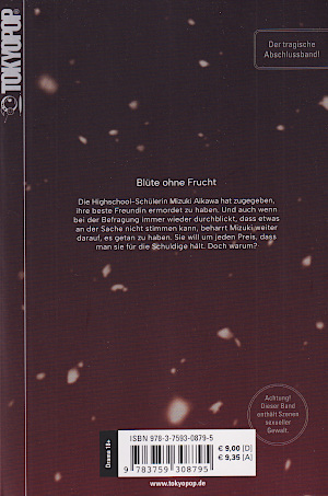 © 2020 NON TokyopopAls die Schülerin Mizuki Aikawa hört, dass man die Leiche ihrer besten Freundin Mako Igarashi gefunden hat, geht sie direkt zur Polizei und legt das Geständnis ab, dass sie sie ermordet hat. Dabei war Mako ihre einzige Freundin. Auch wenn sie arm war und ihre Mutter verloren hatte, war sie immer fröhlich. So ging Mizuki nach der Nachhilfe immer lieber zu dem kleine Imbiss von Makos Onkel, in dem sie arbeitete, als nach Hause, wo ihre strenge Mutter auf sie wartete. Im Verhör gibt Mizuki dann aber einen Mord zu. Makos Onkel soll versucht haben, sie zu vergewaltigen und da hat sie ihm mit einem Messer den Hals aufgeschlitzt. Zusammen mit Mako hat sie auch diese Leiche beseitigt. Da nach den Angaben von Mizuki beide Opfer gefunden werden, wird sie in Untersuchungshaft gesteckt. Ihrem Pflichtverteidiger Yutaka Tsuji erzählt Mizuki, dass sich Mako von deren ehemaligen Freund Yuki Akatsuki gestalkt wird. Tatsächlich bekommt sie es auch mit. Und als sie ihn verfolgt, geht er zu dem Laden von Makos Onkel. Mizuki überlegt, ob sie ihn auch töten soll, um Mako zu beschützen. Doch da er sie bemerkt, spricht sie ihn an. Da er Mako anscheinend doch mag und nur besorgt um sie ist, erzählt ihm Mizuki alles. Gemeinsam brechen sie in den Imbiss ein, um Beweise, die Mako belasten, zu beseitigen. Doch dabei werden sie von Mako beobachtet. Als Mako dann deswegen Mizuki zur Rede stellt, rangeln sie um das Tatmesser, wodurch Mizuki Mako aus Versehen ersticht. Tsuji kommt diese Geschichte allerdings merkwürdig vor und auch wenn er sich eigentlich nicht so für den Fall interessiert hat, will er versuchen, hinter das Geheimnis der Tat zu kommen. Der Manga erzählt von einem Fall, bei dem die Verdächtige klar die Morde gesteht. Aber es gibt kleine Ungereimtheiten bei den Indizien, ihren Aussagen und ihrem Verhalten, dass ihren Anwalt stutzig werden lässt. So ist am Ende bei dem Fall nichts so klar, wie es anfänglich scheint. Zumal es um Teenager geht, die ihre Gefühle nicht unter Kontrolle haben. Grafisch ist der Manga sehr gut. Die Charaktere sind gut getroffen und individuell gestaltet. Die Frisuren passen zu den Charakteren. Sie sind wie die Gesichter fein und detailliert gezeichnet, wobei besonders die Erwachsenen individuelle Gesichter haben. Auch wenn die Gefühle teilweise aufgesetzt wirken, werden sie gut dargestellt. Die Kleidung, Schuluniformen, Geschäftsanzüge oder Freizeitkleidung, ist allerdings einfacher gestaltet. Doch mit den vielen Falten und Schattierungen passt sie gut zu den Posen und den verschiedenen Perspektiven, aus denen die Charaktere gezeigt werden. Sowohl die Morde als auch die versuchte Vergewaltigung werden sauber dargestellt. So ist hier auch viel Blut zu sehen. Die Gegenstände und Hintergründe sind ebenfalls sehr sauber und detailreich gezeichnet. |