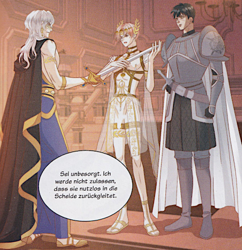 © 2024 J. N. ManlinIn seinem früheren Leben war der Leibritter Sorin der Scharfrichter des Herrschers, der sich in ihn verliebt hatte. Da der Blick des Scharfrichters Unglück verheißt, hat er aber den Herrscher nie angeblickt. So ließ sich der Herrscher selber hinrichten, um einen Blick des Scharfrichters zu erhaschen. Nun ist der Herrscher als Dritter Prinz Lucius wiedergeboren und der Scharfrichter als ein Ritter. Mit seiner Macht verfügte Lucius, dass Sorin sein Leibritter wurde. Allerdings ist das Leben von Lucius so ausschweifend, dass er in die Küstenstadt Xanetheria verbannt worden ist. Dort pflegt er zwar seinen Lebensstil weiter, aber zu seinem Unglück will sich Sorin nie daran beteiligen. Sorin kann aber nicht verhindern, dass in Lucius ihn auf seinem Höhepunkt küsst. Als sich Lucius um die Staatsgeschäfte kümmern und Xanetheria nach seinen Wünschen umbauen will, stößt er auf den Widerstand der alten Senatoren, allen voran Golon. Doch er setzt sich durch, nur um festzustellen, dass die Staatskassen bereits geplündert worden sind. Noch während er überlegt, was er tun kann, kommt sein Bruder, der Zweite Prinz Sobel, in die Stadt und bringt Geld mit. Denn er hat von der finanziellen Lage Xanetherias gehört. Aber Sobel hat noch ein besonderes Geschenk für Lucius und zwar eine Bondage, die er sofort an ihm ausprobiert. Aber er treibt es so weit, dass am Ende Sorin einschreiten muss. Auch wenn Sobel wütend ist, wird Sorin von Lucius verteidigt. Denn Sorin hat nur seinen Job getan, indem er ihn vor körperlichen Schaden bewahrt hat. Außerdem ist Lucius glücklich, dass Sorin ihn zum ersten Mal richtig beachtet hat. In dem Manhwa geht es um die Liebe einer Prinzen zu seinem Leibwächter. Aber um den Leibwächter zu provozieren und weil es ihm Spaß macht, hat er viel Sex mit den verschiedenen Männern der Stadt. Aber er wehrt sich auch nicht, als ihn sein Bruder über ihn herfällt. So geht in dem Manhwa auch um viel Sex. Grafisch ist der Manhwa in Ordnung. Die Charaktere sind fein und individuell gestaltet. Die Frisuren sind unterschiedlich dargestellt. Auch die Gesichter sind fein gezeichnet. Die Gefühle sind teilweise fein umgesetzt, aber teilweise auch nur grob dargestellt. Die meisten Charaktere tragen fein ausgearbeitete Togen. Diese sind mit Borten, Schleifen und Ketten verziert. Auch Umhänge gehören dazu. Sorin hingegen trägt eine gut ausgearbeitete schwere Rüstung. Auch diese ordentlich graviert. Nackt sind die Charaktere gut gebaut gezeigt, wobei Lucius etwas schlaksig wirkt. Die vielen erotischen Szenen sind auch abwechslungsreich gestaltet,wobei die Geschlechtsorgane zensiert sind. Die Gegenstände wie Schmuck oder Geschirr sind sauber und detailreich gezeichnet. Auch die Hintergründe sind detailliert gestaltet. |