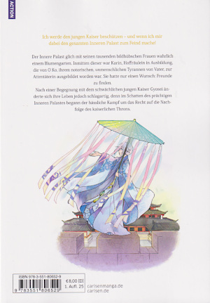 © 2022 Tabasa Iori Carlsen VerlagO Karin ist im Reich Hokugi ein Hoffräulein in Ausbildung. Ihr Problem ist, dass ihr Vater O Ko ein Beamter am Hof ist, dem nachgesagt wird, dass er Feinde ohne Rücksicht foltert oder gar tötet. Dennoch will Karin im Inneren Palast ausgebildet werden, in dem ihr Vater arbeitet. Und auch wenn sie sich dafür lossagt, gibt er ihr Dossiers über jeden Bewohner des Palastes mit. Doch es stellt sich heraus, dass es ihr kaum möglich ist, Freunde zu finden. Sobald die Leute ihren Namen hören, verbinden sie ihn sofort mit ihrem Vater und weichen erschreckt zurück. Als Karin von ihrer Ausbilderin Rikukei die Aufgabe bekommt, ein Kissen für die Gemahlinnen des Kaisers zu besticken, sieht sie aber ihre Zeit für gekommen. Denn dank dem Dossier ihres Vaters weiß sie, was die Gemahlinnen mögen. Ihre Stickerei gelingt, aber Choko und Joju, die mit ihr in Ausbildung sind, befürchten, dass sie mit der Stickerei die Gemahlinnen vergiften will und zerstören ihre Stickerei. Durch einen Zufall kommt Karin dazu. Sie ist schließlich so frustriert, dass sie die Schließzeit ihrer Unterkunft versäumt. Ein Angestellter ihres Vaters, der plötzlich auftaucht, bietet ihr an, das Tor für sie zu öffnen. Aber weil er von ihrem Vater kommt, lehnt sie sein Angebot ab. So sitzt Karin verzweifelnd an der Mauer zu ihrer Unterkunft, zumal es auch noch zu regnen beginnt. Doch plötzlich taucht ein anscheinend reicher Junge aus der Dunkelheit auf und überreicht Karin seinen Regenschirm. Karin ist verblüfft, zumal sie weiß, dass der einzige Junge im inneren Palast der zehnjährige Kaiser sein muss. Die Brüder des Kaisers wurden ermordet. Und nun streiten sich die Gemahlin des verstorbenen Kaisers Ka, die Großmutter des Kaisers, Kengen und die Kronprinzessin und Tochter des Kaisers, Koki, um die Macht im Reich. Weil der Kaiser nett zu ihr war, sieht Karin in ihm einen Freund. Das ermutigt sie dazu, ihre Stickerei noch einmal zu fertigen. Am nächsten Tag ist das Laba-Fest. Auszubildende wie Karin müssen aber den ganzen Tag in der Küche schuften. Erst abends bekommen auch sie besseres Essen ab. Plötzlich fällt auf, dass Joju fehlt. Weil sie schon länger weg ist, eilt Karin zu Ställen, wo Joju zuletzt gesehen wurde. Unterwegs begegnet sie einer anderen Auszubildenden mit einem geschmückten Schaf. Zu ihrem Entsetzen bemerkt Karin, dass sie diese Auszubildende nicht kennt. Sie eilt zu Stall und findet dort Jojus Leiche. Die Auszubildende entpuppt sich als Attentäterin, die Jojus Kleidung gestohlen hat. Im Kampf kann Karin die Attentäterin besiegen. Sie drückt Joju noch die Waffe der Attentäterin in die Hand, damit sie als Held gefeiert wird. Und sie beschließt, den Kaiser zu beschützen, egal wie viele Feinde sie sich damit macht. Aber sie will auch mit Choko und anderen Hoffräulein befreundet sind. Selbst wenn sie von denen abgelehnt wird. Der Manga erzählt von einer jungen Frau, die als Hoffräulein arbeiten will. Sie hat aber von ihrem Vater eine Ausbildung als Attentäterin enthalten, was sie nutzt, um unauffällig Attentäter auszuschalten. Die Bediensteten fürchten sich aber vor ihrem Vater. So muss Karin auch gegen dessen Ruf kämpfen, wobei sie allerdings nicht weiß, dass er sie heimlich für seine Ziele ausnutzt. Grafisch ist der Manga in Ordnung. Die Charaktere sind detailliert und abwechslungsreich gestaltet. Die Frisuren sind sauber und detailreich gezeichnet. Auch die Gesichter sind fein dargestellt, wobei ausgerechnet bei Karin die Augenringe übertrieben gezeigt werden. Die Mimik ist dennoch fein gezeichnet. Als Kleidung werden lange Gewänder mit weiten Ärmeln getragen, die je nach Rang mit Borten geschmückt sind. Mit den Falten wirken sie sehr real. Die Gegenstände wie Schmuck, Stickereien oder Waffen sind detailliert gezeichnet. Kämpfe und andere Aktionen von Karin sind kurz, aber dynamisch, da sie nicht auffallen sollen. Allerdings werden auch Blut und Leichen mit verzerrten Gesichtern gezeigt. Auch die unterschiedlichen Tiere, Schafe oder Vögel sind detailreich getroffen. Die Hintergründe, meistens nur der Palast von innen und außen, sind ebenfalls sauber und detailliert gezeichnet. |