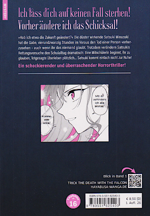 © 2020 Ryouko HayabusaDie Schülerin Satsuki Minazuki hat die seltsame Gabe, die Leichen von Menschen zu sehen, wie sie 24 Stunden später gestorben sind. Allerdings ist das Schicksal nicht unabänderlich, so dass sie noch etwas unternehmen kann, um die Leute zu retten. Jetzt hat Satsuki die kopflose Leiche ihrer Klassenkameradin Komako Komachi im Flur entdeckt. Sie will sie warnen, wird aber von ihr und ihren Freundinnen als Spinnerin abgetan. Dennoch will sie Komako nicht sterben lassen. So beginnt Satsuki mit der Untersuchung der Leiche im Schulflur und des Kopfes, der im Garten liegt. Leider kann sie die Leichen nur sehen und nicht berühren oder bewegen. Und da nur sie diese Leichen sehen kann, kommt es den anderen Schülern seltsam vor, wie sie auf dem Boden umher kriecht, um mehr über die Todesursache zu erfahren. Da der Kopf, und ein Teil des Armes, anscheinend mit einem Schlag abgetrennt worden sind, scheiden Schwerter und andere Hiebwaffen aus, da damit meistens mehrere Schläge benötigt werden. Eine Kettensäge käme in Betracht, aber die gibt es an der Schule kaum. Doch dann sieht Satsuki kurz vor dem Todeszeitpunkt von Komako eine Frau mit Kettensäge. Diese entpuppt aber als die Kunstlehrerin, die damit einen Holzblock bearbeitet. Doch dann entdeckt Satsuki die Ursache für den Tod. Gerade rechtzeitig kann verhindern, dass Komako stirbt, wobei sie sich selber in Gefahr bringt. Immerhin wird Komako danach Satsukis Freundin. Allerdings nicht, weil sie sie gerettet hat, sondern weil sie glaubt, dass ihr Mobbing gegenüber Satsuki sie fast in den Selbstmord getrieben hat. Allerdings sieht Satsuki am nächsten Tag wieder Komakos Leiche. Dieses mal mit Brandspuren im Sanitätsraum. In dem Manga geht es für Satsuki darum, ihre Mitschülerinnen vor dem sicheren Tod zu retten. Dafür setzt sie alles aufs Spiel. Sowohl ihr Ruf in der Schule als auch ihr eigenes Leben sind ihr dabei egal. Nur sieht sie eines Tages auch eine Leiche von jemanden, den sie eigentlich hasst. Grafisch ist der Manga dabei sehr gut. Die Charaktere sind sehr sauber und abwechslungsreich gestaltet. Besonders die Frisuren der Schülerinnen unterscheiden sich sich sehr und sind detailliert gezeichnet. Die Gesichter selber ähneln sich etwas. Sie sind auch gröber gezeichnet, weshalb die Emotionen teilweise übertrieben dargestellt werden. Die Schuluniformen, die die Schülerinnen tragen, sind einfach gestaltet. Aber mit Falten und den fliegenden Röcken sind sie detailliert gezeichnet, zumal sie sich gut den Körpern anpassen. Auch wenn der Manga von blutigen Leichen handelt, gibt es keine Splatterszenen. Die Leichen werden von einem dunklen Nebel umgeben, der kaum Details zeigen lässt. Es gibt zwar auch einige Wunden zu sehen, aber diese sind eher leichter Art. So stört das schwarze Blut auch kaum. Die Gegenstände und Hintergründe sind allerdings sehr sauber und detailreich gestaltet. |