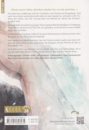 © 2024 Moyori Mori HayabusaVor langer Zeit lebten Menschen und Drachen in dem eisigen Tal zusammen. Doch dann töteten die Menschen einen der Drachen, woraufhin sich der andere bitter rächte. Erst als sich ein junges Mädchen opferte, hörte seine Raserei auf. Seitdem wird alle 20 Jahre eine Jungfrau geopfert. Dieses Jahr hat sich der Außenseiter Rita als Opfer gemeldet. Er ist als Waise aufgewachsen und wurde deswegen nie so richtig von den anderen Dorfbewohnern akzeptiert. So sieht er sich als das ideale Opfer, das am Ende doch noch etwas für Dorf tun kann. Doch Rita ist zwiegespalten, als er durch den Schnee stapft. Einerseits hofft er, dass er ein gutes Opfer darstellen kann. Andererseits fragt er sich, ob es den Drachen immer noch gibt. Da es den bisherigen Jungfrauen verboten worden war, in das Dorf zurückzukehren, sind sie einfach verschwunden. Und angesichts des Schneesturms, durch denn er stapft, vermutet er, dass sie trotz ihrer warmen Kleidung einfach nur erfroren sind. Auch Rita geht es schlecht und er verliert das Bewusstsein. Als er wieder zu sich kommt, befindet er sich in einer warmen Höhle. Sein Bein ist gebrochen, aber auch gleich geschient. Und ein starker Mann mit einem schuppigen Rücken ist auch anwesend. Der Mann ist tatsächlich Ignat, der Drache des Frostgebirges. Er kennt zwar das Ritual der Menschen, die ihm ständig Opfer schicken, aber sieht keinen Bedarf in ihnen. So soll Rita auch wieder verschwinden, sobald sein Bein verheilt ist. Ignat verschwindet mit den Worten, dass Rita die Höhle nicht verlassen soll, wenn er nicht dabei ist. Doch Ritas Bein schmerzt so, dass er hofft, außerhalb der Höhle Heilkräuter zu finden. Doch er wird von einem Wolf angegriffen. Gerade rechtzeitig kommt Ignat und rettet ihn. Damit Rita in Sicherheit ist, wenn Ignat nicht da ist, schenkt der ihm zwei seiner Schuppen, damit deren Geruch die wilden Tiere abschreckt. Aber Ignat ist später überrascht, als er sieht, dass sich Rita daraus Ohrschmuck gemacht hat. Immerhin erlaubt Ignat Rita daraufhin, in seiner Höhle zu bleiben. Mit der Zeit gewöhnen sie sich so aneinander, dass Ignat Rita sogar sein Geheimnis verrät. Denn er ist tatsächlich der letzte der Drachen, die Linie stirbt mit ihm aus. Und mit Menschen kann er sich nicht paaren, da diese das nicht überleben würden. Aber es gibt eine Möglichkeit, Nachwuchs zu erzeugen. Ignat ist dafür das beste Beispiel, denn er ist der Sohn eines Drachens und einer Menschenfrau. Aber diese Verwandlung, Dracomorphose, ist gefährlich und endet oft für den Menschen tödlich. Doch Rita will es versuchen, da er fürchtet, ansonsten von Ignat verstoßen zu werden. Der Manga erzählt von der Liebesgeschichte zwischen einem Menschen und einem Drachen. Zuerst geht es Rita darum, etwas für seinen Stamm zu tun. Aber mit der Zeit gewöhnen sie sich aneinander. Doch dann erfährt Rita die Wahrheit über die Opfer der Menschen. Grafisch ist der Manga gelungen. Die Charaktere sind sauber und detailreich gestaltet. Die Frisuren sind detailliert gezeichnet. Mit den feinen Gesichtern lassen sich die Gefühle gut darstellen. Als Kleidung tragen sie Felle und Umhänge. Diese sind wie alle Gegenstände ebenfalls detailliert gezeichnet. Auch die Körper sind gut getroffen. Besonders Ignat wird oft nackt gezeigt, allerdings sind die erotischen Szenen recht harmlos. Die Drachenform von Ignat ist eindrucksvoll umgesetzt. Es gibt wenige Hintergründe, die detailreich gestaltet sind. |