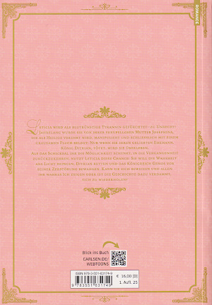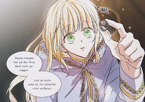 © 2022 Jiei Kim / Yujeong Han hound C LinesJosephina ist die größte Heilige, die das Heilige Königreich je gesehen hat. Allerdings hat ihre Kraft in der letzten Zeit stark nachgelassen, wofür sie ihrer Tochter Leticia die Schuld gibt. So schikaniert sie Leticia wann immer sie kann und wünscht ihr den Tod. Da kommt Leticias Bruder auf die Idee, sie mit König Ditrian aus dem Königreich Genos zu verheiraten. Josephina hasst ihn fast genauso wie Leticia und hat vor sieben Jahren einige seine Angehörigen töten lassen. Allerdings hat sie es so aussehen lassen, dass Leticia die Schuldige ist. Und nur für den Fall, dass Ditrian Leticia als Josephinas Tochter deswegen nicht umbringt, belegt sie Leticia während der Hochzeit mit einem Fluch. Sollte Leticia Ditrian nicht innerhalb von sechs Monaten töten, wird sie in Stücke gerissen. Tatsächlich verliebt sich Leticia in Ditrian und betet verzweifelt um einen Ausweg. Als es soweit ist und sie stirbt, erwacht sie aber wieder zwei Tage vor ihrer Hochzeit mit Ditrian. Auch wenn Leticia plant, Ditrian zu retten, so bleibt ihr nicht viel Zeit. Sie weiß inzwischen, dass es in der Begleitung von Ditrian mehrere Verletzte gegeben hat, die wegen dem Befehl der Heiligen nicht versorgt wurden. Und schließlich ist einer von ihnen an seinen Verwundungen gestorben. So schleicht sich Leticia in ein altes Gebäude, in dem wertlose Reliquien lagern, die ihre Macht verloren haben. Dort findet findet ein Kästchen mit einem Heilkraut. Sie will das Gebäude gerade verlassen, als ihr ein Ring auffällt. Dieser Ring symbolisiert die Macht der Götter und sollte eigentlich an der Hand von Josephina stecken. Doch Leticia bemerkt, dass er zersprungen ist, was bei einem solchen Artefakt nicht passieren kann. Sie vermutet daher, dass der Ring nur eine Kopie ist. Dennoch steckt sie ihn ein. Als Leticias mit dem Heilkraut bei Ditrians Delegation ankommt, herrscht gerade großer Ärger. Denn ihm wurde ein Heilkraut gegeben, dass Enoch, den Verletzten, töten würde. Und zu allem Überfluss tauchen auch noch Priester au, um die Einnahme der Medizin zu überwachen. Leticia freut sich aber über die Ablenkung, denn sie kann nun so unerkannt in das Zimmer von Enoch schlüpfen und ihn so retten. Der Manhwa erzählt von einer Prinzessin, die versucht, ihren geliebten Prinzen zu retten. Aber die Heilige hat Jahrelang ihren Namen missbraucht, um Untaten anzurichten, so dass sie einen sehr schlechten Ruf hat. Ditrian heiratet sie auch nur, damit Josephinas Wut sich nicht gegen sein Reich richtet. Da Leticia sich aber nicht nur in Ditrian verliebt, sondern sie auch sein Reich und sich retten will, versucht sie alles, damit ihm und seinen Leuten geholfen wird. Dadurch gibt es aber auch viele Rückblenden, die etwas verwirrend sind. Grafisch ist der Manhwa in Ordnung. Die Charaktere sind gut getroffen, sehen sich aber auch etwas ähnlich. Besonders die Männer unterscheiden sich teilweise nur durch die Haarfarbe, die Frisuren und Gesichter unterscheiden sich kaum. Und während die Frisuren noch etwas detaillierter dargestellt werden, sind die Gesichter so einfach gezeichnet, dass sie die Emotionen nur grob darstellen können. Die Frauen haben dagegen verschiedene Frisuren. Und auch die Gesichter unterscheiden sich stark mit den unterschiedlichen Augen. Die Kleidung ist unterschiedlich und detailliert gestaltet. Die Männer tragen oft Uniformen und Priesterroben, aber je nach Rang unterscheiden sich diese. Die Uniformen sind mit Bändern, Borten und Knöpfen verziert. Allerdings verschwinden diese oft auch unter recht tristen Umhängen. Die Frauen tragen dagegen unterschiedliche Kleider, die teilweise mit viel Spitze geschmückt sind. Insgesamt ist die Kleidung mit Falten ordentlich gezeichnet. Die Gegenstände wie Schmuck, die heiligen Requisiten oder die Heilkräuter sind sauber und detailliert gestaltet. Verschiedene Grausamkeiten gegenüber von Charakteren oder Schlachten werden erwähnt, aber nie explizit dargestellt. Die Hintergründe des Manhwas sind detailliert gezeichnet. Etwas negativ fällt auf, dass die Schrift wegen geringer Kontraste teilweise sehr schwierig zu lesen ist. |