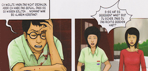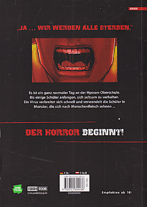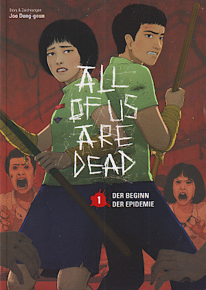 ![]() © 2021 Donggeun Joo Planet MangaEs ist wieder ein langweiliger Tag an der Hyosan-Highschool. Bis die Schülerin Hyeon-Ju in den Unterricht von Frau Park platzt. Angeblich hat der Wissenschaftslehrer, Byeong-Chan Lee, sie gefesselt und drei Tage lang eingesperrt. Frau Lang ist entsetzt, weiß aber auch nicht genau, was sie machen soll. So lässt sie Hyeon-Ju Kim unbemerkt von Herrn Lee ins Krankenzimmer bringen. Dort berichtet Hyeon-Ju, dass sie von Herrn Lee gefesselt worden war, als er sie in seinem Labor bei seinen Hamstern erwischt hat. Bevor der Krankenwagen für Hyeon-Ju kommt, beißt sie allerdings ihre Mitschülerin Sak, die sich um sie kümmert. Nachdem Hyeon-Ju abtransportiert ist, kommt auch die Polizei, die sich um Herrn Lee kümmert. Der ist allerdings entsetzt, dass Hyeon-Ju seinem Labor entkommen konnte. Noch während Herr Lee verhört wird, meldet sich Sak bei ihrer Freundin On-Jo krank. Sie bitte sie darum, ein Medikament aus dem Krankenzimmer zu holen. Doch bevor sie zurück kommt, beißt Sak dem Lehrer die Kehle durch. Noch während die Schüler in der Klasse entsetzt sind, erwacht der Lehrer wieder zum Leben und gemeinsam mit Sak richtet er ein Blutbad an. So wird in dem Manhwa genau gezeigt, wie sich die Zombie-Apokalypse von der Schule her ausbreitet und schließlich die ganze Stadt erfasst.. Schließlich ist Hyeon-Ju mit dem Krankenwagen fortgebracht worden. On-Jo irren durch die Stadt in der Hoffnung, nicht auf Zombies zu stoßen, während Herr Lee, der weiß, worum es geht, bei der Polizei im Verhör sitzt. Grafisch ist der Manhwa eher durchwachsen. Die Charaktere sind einfach und teilweise leicht verwechselbar gezeichnet. Besonders die Schüler sehen sich sehr ähnlich. So gibt es nur wenig unterschiedliche Frisuren für Haare, die eng am Kopf liegen. Auch die relativ konturlosen Gesichter bieten nur wenig Abwechslung. Teilweise tragen die Charaktere Brillen und ältere Charaktere habe ein paar Falten. Auch die Gefühle sind nur einfach dargestellt. Als Zombies wird die Haut dunkler dargestellt und die Augen sind blutrot unterlaufen. Dabei fletschen sie immer ihre blutigen Zähne. Teilweise zeigt der Manhwa auch die Sicht der Zombies. Sie ist tiefrot und ähnelt den Bildern von Wärmekameras. Auch die Kleidung ist einfach. Neben der Schuluniform mit grünen Shirts werden Anzüge getragen. Alle Kleidung ist dabei sehr detailarm umgesetzt. Auch wenn es ein Zombiemanhwa ist, bei dem die Zombies um sich beißen, gibt es eigentlich keine Splattereffekte. Es gibt auch kaum Kämpfe, da eher versucht wird, die Zombies festzuhalten. Die Gegenstände wie Besen oder Energiedrinks sind einfach, aber gut erkennbar dargestellt. Die Hintergründe sind meistens detailarm gezeichnet. |