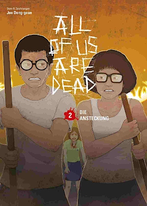 © 2021 Donggeun Joo Planet MangaEs ist wieder ein langweiliger Tag an der Hyosan-Highschool. Bis die Schülerin Hyeon-Ju in den Unterricht von Frau Park platzt. Angeblich hat der Wissenschaftslehrer, Byeong-Chan Lee, sie gefesselt und drei Tage lang eingesperrt. Frau Lang ist entsetzt, weiß aber auch nicht genau, was sie machen soll. So lässt sie Hyeon-Ju Kim unbemerkt von Herrn Lee ins Krankenzimmer bringen. Dort berichtet Hyeon-Ju, dass sie von Herrn Lee gefesselt worden war, als er sie in seinem Labor bei seinen Hamstern erwischt hat. Bevor der Krankenwagen für Hyeon-Ju kommt, beißt sie allerdings ihre Mitschülerin Sak, die sich um sie kümmert. Nachdem Hyeon-Ju abtransportiert ist, kommt auch die Polizei, die sich um Herrn Lee kümmert. Der ist allerdings entsetzt, dass Hyeon-Ju seinem Labor entkommen konnte. Noch während Herr Lee verhört wird, meldet sich Sak bei ihrer Freundin On-Jo krank. Sie bitte sie darum, ein Medikament aus dem Krankenzimmer zu holen. Doch bevor sie zurück kommt, beißt Sak dem Lehrer die Kehle durch. Noch während die Schüler in der Klasse entsetzt sind, erwacht der Lehrer wieder zum Leben und gemeinsam mit Sak richtet er ein Blutbad an. So wird in dem Manhwa genau gezeigt, wie sich die Zombie-Apokalypse von der Schule her ausbreitet und schließlich die ganze Stadt erfasst.. Schließlich ist Hyeon-Ju mit dem Krankenwagen fortgebracht worden. On-Jo irren durch die Stadt in der Hoffnung, nicht auf Zombies zu stoßen, während Herr Lee, der weiß, worum es geht, bei der Polizei im Verhör sitzt. Grafisch ist der Manhwa eher durchwachsen. Die Charaktere sind einfach und teilweise leicht verwechselbar gezeichnet. Besonders die Schüler sehen sich sehr ähnlich. So gibt es nur wenig unterschiedliche Frisuren für Haare, die eng am Kopf liegen. Auch die relativ konturlosen Gesichter bieten nur wenig Abwechslung. Teilweise tragen die Charaktere Brillen und ältere Charaktere habe ein paar Falten. Auch die Gefühle sind nur einfach dargestellt. Als Zombies wird die Haut dunkler dargestellt und die Augen sind blutrot unterlaufen. Dabei fletschen sie immer ihre blutigen Zähne. Teilweise zeigt der Manhwa auch die Sicht der Zombies. Sie ist tiefrot und ähnelt den Bildern von Wärmekameras. Auch die Kleidung ist einfach. Neben der Schuluniform mit grünen Shirts werden Anzüge getragen. Alle Kleidung ist dabei sehr detailarm umgesetzt. Auch wenn es ein Zombiemanhwa ist, bei dem die Zombies um sich beißen, gibt es eigentlich keine Splattereffekte. Es gibt auch kaum Kämpfe, da eher versucht wird, die Zombies festzuhalten. Die Gegenstände wie Besen oder Energiedrinks sind einfach, aber gut erkennbar dargestellt. Die Hintergründe sind meistens detailarm gezeichnet. |