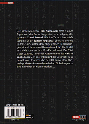 © 2023 Masanori Morita Planet MangaKai Yamauchi ist ein neuer Lehrer an einer Schule im Stadtteil Akiruno von Tokio. Die anderen Lehrer stören sich an ihm, dass er in den Pausen seine geliebten Stephen King-Romane liest. Aber die Ruhe wird gestört, als die Mutter des Schülers Manabu Yasamura ankommt und behauptet, dass ihr Sohn gemobbt wird. Seine Schulbücher sind vollgeschmiert. Allerdings wird schnell festgestellt, dass Manabu seine Bücher selber beschmiert hat. Kais Kollegen warnen ihn aber, den Fall nicht an die große Glocke zu hängen. Denn an der Schule war bislang kein Mobbing bekannt und Direktor Kajioka will demnächst mit reiner Weste aufhören. Kais Freundin Tamao Yagisawa hat andere Probleme. Sie ist neu in der Redaktion von dem Tsubasa-Verlag und sollte dem Schriftsteller Seiya Motoyashiki zur Hand gehen. Doch der ist sofort beleidigt, weil sie ihn auf die Plagiatsgerüchte angesprochen hat, die seit kurzem im Internet kursieren. Zur Strafe muss Tamao abgelehnte Manuskripte durchlesen, um zu prüfen, ob es sich vielleicht lohnt, mit dem einen oder anderen Autor für ein anderes Projekt zusammenzusetzen. Außerdem soll sie so lernen, was gute Literatur ausmacht. Aber gleich die erste Geschichte, „Zashizu“, ist eine recht fade und vorhersehbare Rachegeschichte, bei dem sich der Autor in der Ich-Perspektive dafür rächt, als Schüler gemobbt zu werden. So ist Tamao froh, dass sie sich abends mit Kai in einem kleinen Restaurant treffen kann. Kai ist allerdings entsetzt, als er in den Nachrichten hört, dass Yuuki Suzuki ermordet wurde, indem man ihn gefesselt vom Dach gestoßen hat. Denn Yuuki war früher mit ihm in einer Klasse. Erschüttert macht sich Kai zusammen mit Tamao auf den Weg nach Hause, damit sie dort noch etwas in Ruhe trinken können. Aber sie werden von Shintarou Tamiya gestört, der ein Nachbar von Kai ist und der ebenfalls mit ihm früher zur Schule ging. Doch anstatt Yuuki zu betrauern, erzählt er, wie Mitschüler in der Klasse gemobbt worden sind und macht sich über sie lustig. Tamao hat davon schließlich genug und geht. Am nächsten Tag muss Tamao Postkarten beantworten, die Chefredakteurin Miwa bekommt. Der Autor von „Zashizu“ will wissen, wie die Redaktion seine Geschichten bewertet. Tamao will ihn schnell abwimmeln, aber er lässt nicht locker. Um eine genauere Antwort zu formulieren, nimmt sie sich das Skript noch einmal vor. Da hört sie in den Nachrichten, dass ein weiterer Klassenkamerad von Kai grausam getötet worden ist. Dabei fällt ihr auf, dass sich die Mordserie dem Manuskript „Zashizu“ ähnelt. Verwirrt ruft sie Kai an. Von Seiya, der bei Kai mithört, erfährt Tamao, dass er eine Einladung zu einem Klassentreffen bekommen hat. Diese Einladung kommt auch in dem Manuskript vor und ist eine Einladung des Mörders, um leichter weiter töten zu können. In dem Manga geht es um Mobbing und späte Rache. Ein Lehrer und seine Freundin werden in eine alte Geschichte verwickelt, in der ein Mörder einige Leute grausam ermordet. Der Zusammenhang besteht darin, dass sie vor langer Zeit Klassenkameraden von Kai waren und damals hemmungslos ihre Mitschüler gemobbt haben. Aber Kai ist sich sicher, dass der angebliche Autor des Skripts nicht mehr am Leben ist. Denn er war bei dessen Tod dabei. Grafisch ist der Manga etwas gewöhnungsbedürftig.Die Charaktere sind sauber und detailliert gestaltet. Die Frisuren sind unterschiedlich und passend zu den Rollen, die sie verkörpern. Auch die Gesichter sind detailliert und trotz der vielen Charaktere abwechslungsreich gezeichnet. Die Gesichter weichen aber trotz der Detailverliebtheit von den üblichen Mangagesichtern ab. Aber dafür können sie gut die Emotionen darstellen, wodurch die Gesichter teilweise aber auch verformt aussehen. Die Kleidung ist sehr unterschiedlich, neben Anzügen und Schuluniformen wird auch einfache, aber unterschiedliche Freizeitkleidung getragen. Durch Falten und Schattierungen wird sie aber auch realistisch dargestellt. Die Gegenstände, aber auch die Tiere sind sehr sauber gezeichnet. Da es um Mobbing und brutale Morde geht, werden auch viele blutige Szenen gezeigt. Zwischendurch sind auch ein paar wenige Sexszenen zu sehen. Auch die Hintergründe sind sauber und detailreich gezeichnet. |