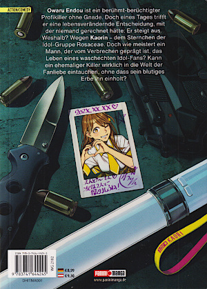 ![]() © 2023 Rintarou Ooshima Planet MangaOwaru Endou ist einer der besten Auftragskiller. Er arbeitet für die Verbrecherorganisation Fujiyama-Kai und schon sein Name ist in der Unterwelt gefürchtet. Denn er erledigt seine Aufträge schnell, sicher und präzise. Das Aufräumkommando, dass hinter ihm die Leichen beseitigt, verehrt ihn inzwischen als eiskaltes, unerschütterliches Idol. Doch privat ist Endou ganz anders. Er verehrt die Sängerin Kaori Minaboshi der Idolgroup Rosaceae, die er Kaorin nennt, abgöttisch. Eines Tages kommt er zu einem Meet and Greet mit Kaorin und stellt fest, dass er ihr nicht seine blutbesudelte Hand reichen kann. Das würde sie beschmutzen. So kündigt Endou kurzerhand seinen Job persönlich bei Hideyoshi Fujiyama im Fujiyama-Tower. Fujiyama akzeptiert die Kündigung, ist aber nicht sehr erfreut darüber. Endou beginnt daraufhin in einem Schnellrestaurant zu arbeiten. Denn er will nicht, dass er Kaorin mit seinem blutigen Geld beschmutzt. Alles Geld, was er für sie ausgibt, soll durch normale Arbeit verdient werden. Er muss sich anstrengen, denn demnächst steht das erste Solokonzert von Rosaceae an, zu dem er unbedingt gehen muss. Allerdings wird Kaorin vor dem Konzert entführt. Die Entführer wollen Kaorins Vater, den Premierminister Minabishi, erpressen. Sie haben früher öfters für ihn gearbeitet, aber seit er Premierminister geworden ist, will er nichts mehr von ihnen wissen. Zu spät erfahren sie, dass Endou zu Kaorins größten Fans zählt. So verpasst er zwar fast das Konzert, aber die Gang wird ihr keine Schwierigkeiten mehr machen. Aber dann überrascht Kaorin Endou mit der Neuigkeit, dass sie für die Band ein T-Shirt kreiert hat. Und sie bittet ihn, sich als ihr Fan von seinem Anzug zu trennen und ihr Shirt zu tragen. Kaorin ahnt nicht, dass das eine schwere Entscheidung für Endou ist. Denn der Anzug ist nicht nur seine Kleidung, er ist auch für den Job des Hitman gedacht. So ist er gegen jede Waffe gepanzert und in den vielen kleinen Taschen kann Endou unauffällig seine Waffen verstauen. Ohne seinen Anzug fühlt er sich nackt. Doch als Endou es schafft, in T-Shirt zu Kaorins Konzert zu gehen, fühlt er sich auf einmal leicht und frei. Denn er hat übersehen, dass der Anzug mit der Panzerung und den Waffen viel wog. So nutzt er das aus und feuert Kaorin wie wild an. Aber er muss feststellen, dass er damit sehr übertreibt. Immerhin schafft Endou es, sich mit Yoshida, der Koume Yamamoto aus Rosaceae verehrt, anzufreunden. In dem Manga geht es um die Wandlung eines Profikillers zu einem normalen Fan eines Popsternchens. Dabei stellt er fest, dass es nicht einfach ist, sein Verhalten zu ändern. Aber wenn Kaorin ihn um etwas bittet, muss er ihrer Bitte nachkommen. Und er hat noch viel zu lernen, was es bedeutet, ein echter Fan eines Idols zu sein. Grafisch ist der Manga gelungen. Die Charaktere sind detailliert und abwechslungsreich gezeichnet. Endou ist als brutaler Killer gut gestaltet, aber als Fan einer jungen Frau muss er weicher werden. Die Gesichter und Frisuren sind sauber und unterschiedlich gestaltet. Die Emotionen sind gut getroffen, nur Endou wirkt teilweise sehr düster. Auch die Kleidung ist gut gestaltet. Kaori und die anderen Mitglieder von Rosaceae tragen detailreich gezeichnete Kleider, während der schwarze Anzug von Endou mit seinen Falten gut gestaltet ist. Auch andere Kleidung wie die Shirts sind detailliert umgesetzt. Gegenstände wie die Leuchtstäbe, die Idol-Karten, Kameras oder einfach nur Brot sind ebenfalls sauber gezeichnet. Die Kämpfe sind sehr dynamisch, wobei sie nach seinem Ausscheiden aus der Yakuza nicht mehr so blutig sind. Unter anderen deshalb, weil Endou nun mit Leuchtstäben kämpft. Die Hintergründe sind ebenfalls gut getroffen. |