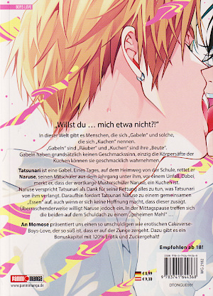 ![]() © 2023 An Momose Planet MangaDie Menschen sind unterteilt in „Gabeln“ und „Kuchen“. Die „Gabeln“ sind die Räuber, die die Beute, den „Kuchen“, aufessen. Allerdings verlieren die „Gabeln“ ihren Geschmackssinn, so dass sie nur noch die Körperflüssigkeiten der „Kuchen“ schmecken. Der Oberschüler Tatsunari ist eine „Gabel“, der sich mit seinen Freunden etwas arrogant über andere lustig macht. Denn auch wenn seine Noten nicht die besten sind, spottet über den etwas schlaksigen Schulbibliothekaren. Kurz darauf sieht Tatsunari an einer Baustelle, wie Rohre abrutschen. Er packt den Mann vor sich und rettet so beide aus der Gefahrenzone. Da Tatsunari bewusstlos wurde, bringt ihn der Mann nach Hause. Dort wartet er, bis Tatsunari aus seiner Bewusstlosigkeit erwacht, um danach zu gehen. Es stellt sich heraus, dass der Mann der Bibliothekar ist und Naruse heißt. Weil er Tatsunari nach Hause gebracht und noch gewartet hat, bis er aufwacht, ist er von Naruse beeindruckt. Er will ihn am nächsten Tag in der Schule aufsuchen, aber er weiß nicht, in welche Klasse Naruse geht und welchem Jahrgang er angehört. Als er schließlich darauf kommt, dass er ja nur in der Bibliothek nachfragen muss, taucht Naruse bei ihm in der Klasse auf. Spontan lädt Tatsunari Naruse zu einem Essen auf dem Schuldach ein. Doch oben scheint es eine schlechte Wahl zu sein, denn es ist dort nicht nur heiß, sondern das Bento von Tatsunari ist auch noch sehr klein. Naruse will sich bei Tatsunari für seine Rettung bedanken, weiß aber nicht genau, wie er es anstellen soll. Als er Tatsunari erklärt, dass er alles machen würde, kommt dem die Idee, dass er gerne an Naruses Hals lecken möchte. Tatsächlich schmeckt er den Schweiß und erfährt so, dass Naruse ein „Kuchen“ ist. Für Tatsunari ist es ein so tolles Geschmackserlebnis, dass er gar nicht mehr aufhören kann, Naruse abzulecken. Auch wenn es den etwas stört, lässt er sich nichts anmerken. So verabreden sie sich am nächsten Tag wieder zu Essen auf dem Dach, was damit endet, dass Tatsunari Naruse ableckt. Doch dieses Mal bemerkt Tatsunari, wie erregt Naruse dabei wird. So geht es in dem Manga um die Beziehung zweier Schüler, deren Abhängigkeit voneinander schließlich bis in die Unizeit hineinreicht. Während Naruse akzeptiert, dass er der unterlegene „Kuchen“ ist, ist Tatsunari fasziniert von dessen Geschmack. Grafisch ist der eher durchschnittlich. Die Charaktere sind einfach gestaltet und unterscheiden sich durch die Haarfarbe und Naruses Brille. Die Haare sind leicht strubbelig und liegen ansonsten am Kopf an. Die Gesichter sind einfach dargestellt, wobei die Gefühle recht gut gezeichnet sind. Die Charaktere tragen Hemden, Shirts und einfache Schuluniformen. Auch wenn sie Falten zeigen, sind sie eher einfach gezeichnet. In den wenigen erotischen Szenen zeigen sie einen normalen Körperbau. Die Geschlechtsteile sind leicht zensiert, aber meistens verdeckt. Die Gegenstände sind einfach, aber gut erkennbar dargestellt. Auch die wenigen Hintergründe sind einfach gezeichnet. |