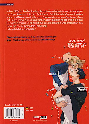 ![]() © 2023 Mottasu Tonooka Planet MangaItalien im Jahr 19XX. Die Gardino-Familie ist in zwei Fraktionen zerstritten. In die Reinblütler, die an den Traditionen festhalten wollen und die Ausländer hassen und den Liberalen, die Veränderungen wollen und Ausländer auch in ihre Reihen mit aufnehmen. Gino Amelia ist der Capo, der Anführer, der Reinblütler. Gerade hat er den Händler Bolgatti dabei erwischt, wie er Waffen in die Stadt schmuggeln wollte und will ihn bestrafen. Doch da kommt die Nachricht, dass sein Haus explodiert ist. Schuld daran ist Dante Bertini, der Capo der Liberalen. Er hat es mit einer Panzerfaust gesprengt. Als Gino Dante dafür zur Rede stellen will, gibt er ihm die Nachricht, dass der Boss sie dringend sprechen möchte. Gino kommt noch gerade rechtzeitig zur Versammlung. Der Boss erklärt ihnen, dass er von seinen Ämtern zurücktritt und die Reinblütler und die Liberalen unter sich ausmachen müssen, wer seinen Nachfolger stellt. Sollte es allerdings dabei Verletzte oder gar Tote geben, würde er zurückkehren und seinen Posten wieder beanspruchen. Und das ist noch nicht alles. Damit sich die Fraktionen vertragen, verfügt der Boss noch, dass sowohl Gino als auch Dante für die Zeit der Verhandlungen gemeinsam auf seinem Anwesen leben sollen. Wütend zieht sich Gino in das Westgebäude zurück. Er verfügt, dass kein Liberaler das Gebäude betreten darf. Denn neben der Einstellung zu den Traditionen laden die Liberalen auch doch die Ausländer, die in Italien aus Afrika anlanden, bei sich ein. Früher hat man die Ausländer gebrandmarkt, weshalb man sie heute noch die Gekennzeichneten nennt. Doch als eine Bettlern, die gerade angekommen ist, an Ginos Tor klopft, wirft er ihr etwas zu Essen zu. Als er zurück auf sein Zimmer geht, wartet dort allerdings Dante auf ihn. Der ist durch einen Geheimgang in diesen Flügel zu kommen. Als Gino ihn bedroht, reißt er ihn um. Dabei entdeckt er, dass Gino das Mal der Gezeichneten trägt. Voll Scham flieht Gino in die Nacht. Er weiß, wenn Dante sein Geheimnis verrät, wird er für immer ein Gejagter sein. Denn dadurch, dass er ein Gezeichneter ist, hat er alle Reinblütler verraten. Doch Gino läuft in eine Gruppe Kleinkrimineller hinein, die auf der Jagd nach Gekennzeichneten sind. Da er sich nicht zu erkennen geben will, bekommt Gino große Probleme. Doch plötzlich taucht Dante mit seiner Truppe auf und rettet ihn. Allerdings will Gino immer noch flüchten, während Dante will, dass er bleibt. Er verspricht ihm, den anderen nichts von dem mal zu erzählen und beißt hinein, um zu zeigen, dass es ihn nicht stört. Doch daraus entwickelt sich zwischen den beiden auf einmal eine Sexszene. Der Manga beschreibt die Beziehung zweier Bosse unterschiedlicher Flügel in einer Familie. Durch ein Geheimnis werden sie aneinander gekettet. Doch sie müssen nicht nur Ginos Geheimnis bewahren, sondern auch ihre Beziehung untereinander und schließlich noch die Nachfolge vom Boss klären. Grafisch ist der Manga in Ordnung. Die Charaktere sind sauber und individuell gestaltet. Die Frisuren und Gesichtern sind gut getroffen und so gezeichnet, dass man sie leicht auseinander halten kann. Die Gefühle werden aber leicht übertrieben dargestellt. Die Kleidung, Anzüge und einfache Hemden, sind ordentlich gestaltet und mit den Falten gut an die Posen angepasst. Nackt wirken die Charaktere aber leicht übertrieben, wobei die erotischen Szenen kaum zensiert sind. Die Gegenstände wie die Waffen und die Hintergründe sind sauber und detailliert getroffen. |