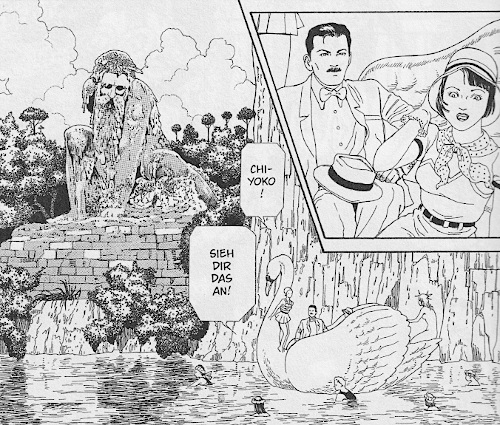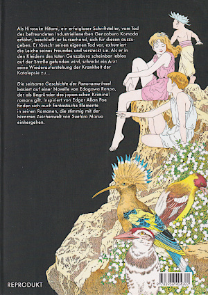 ![]() © 2008 Suehiro Maruo / Ranpo Edogawa ReproduktDer erfolglose Schriftsteller Hirosuke Hitomi ist gerade dabei, sein neustes Werk, „Die Geschichte von Ra“, zu veröffentlichen. Es handelt von einem armen Mann, der unverhofft Reichtum erlangt und damit sein persönliches Paradies erschafft. Sein Redakteur findet das Werk in Ordnung, aber wenig originell. Eher sollte er über etwas aus der realen Welt schreiben, wie zum Beispiel den Rotlichtbezirk bei ihm um die Ecke. Ein halbes Jahr später teilt der Redakteur Hirosuke mit, dass Genzaburo Komoda gestorben ist. Der Redakteur kennt die beiden aus ihrem Studium. Sie sahen sich damals bis auf den Bart zum Verwechseln so ähnlich, dass man sie sogar für Zwillinge gehalten hat. Und auch heute noch sehen sie sich ähnlich. Aber während Hirosuke ein armer Schriftsteller ist, war Genzaburo der Sohn des reichsten Mannes der Provinz. So beschließt Hirosuke kurzerhand, Hirosuke Hitomi zu begraben und Genzaburo Komoda wieder aus dem Grab auferstehen zu lassen. So inszeniert Hirosuke seinen Selbstmord ohne Leiche und reist in die Provinz, in der Genzaburo begraben liegt. Dort gräbt er den Leichnam von Genzaburo und richtet sich so her, dass er dem Toten ähnlich ist. So finden am nächsten Tag ein paar Schulkinder den vermeintlichen Genzaburo halbtot auf der Landstraße. Die Sensation ist groß und sofort wird er ins nach Hause gebracht. Alle sprechen von einem Wunder, dass unerklärlich ist und rätseln, was passiert sein könnte. Doch zunächst glaubt man seine Geschichte. Als Chiyoko, die Ehefrau von Genzaburo, auftaucht, durchschaut sie ihn sofort wegen einem Leberfleck, den er nicht haben dürfte. Doch weil Genzaburo nicht tot sein darf, akzeptiert sie die Lüge als Wahrheit. Und wenn Hirosuke etwas nicht weiß, so führt man es auf seinen vermeintlichen Tod und die lange Zeit im Grab zurück. Nachdem sich Hirosuke eingelebt und die Aufregung um seine Wiederauferstehung gelegt hat, beschließt er, seinen Traum zu verwirklichen. Auf der einsame Insel Okinoshima will er einen Vergnügungspark errichten. Aber nicht einen für Kinder sondern für Erwachsene. So schafft es in dem Manga ein kleiner Schriftsteller seinen Traum von einem Vergnügungspark auf einer Insel zu verwirklichen. Dort dürfen alle Erwachsene ihre Lüste ausleben. Doch Chiyoko bleibt ein Risiko, dass es zu beseitigen gilt. Grafisch ist der Manga gelungen. Die Charaktere sind sauber und individuell gezeichnet. Die Frisuren sind kurz und recht einfach gestaltet. Die Gesichter sind von der Form her und mit Bärten, Brillen und bei älteren Menschen auch mit Falten sehr unterschiedlich dargestellt. Die Emotionen sind aber eher einfach gezeichnet, was die Gesichter etwas leblos, wie Puppen erscheinen lässt. Die Kleidung ist sehr abwechslungsreich. Neben der einfachen Kleidung der normalen Arbeiter tragen die Leute Anzüge und Kimonos. Aber auch verschiedene Uniformen von Militär, Polizei und extravagante aus dem Zirkus werden getragen. Die Kleidung passt gut zu den verschiedenen Rollen und Posen der Charaktere. Da es sich um eine Vergnügungsinsel für Erwachsene handelt, werden auch nackte Menschen beim Sex gezeigt. Die Tiere, die Tiger im Zirkus, die Pfauen auf der Insel oder die Fische Unterwasser sind sehr sauber und detailreich gezeichnet. Die Gegenstände sind sauber gestaltet. Aber detailliert dargestellt werden sie nur, wenn sie für die Geschichte relevant sind. Die Hintergründe sind generell sehr sauber und detailreich gezeichnet. |