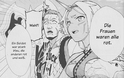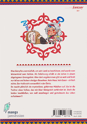 © 2019 Kinta / Yumbo Fuurou Manga JAM SessionDias ist ein braver Bürger des Königreiches, der sich als Soldat in einem langen Krieg gegen den Nachbarstaat hervorgetan hat. Als Dank wird ihm ein Lehen übergeben. Allerdings wird er sofort aus der Stadt zu seinem Lehen gefahren. Dias weiß nicht, was ihn erwartet, aber als er nach einem Monat dort ankommt, erwartet ihn eine Überraschung. Denn sein Lehen ist nur eine einfache riesige Grasfläche ohne ein Gebäude und damit ohne Bewohner. Der Kutscher nennt das Land Nezros, so dass sein Name ab nun Dias Nezros lautet. Dias grübelt, was er mit dem Land anfangen soll. Es gibt zwar einen Bach, aber kaum wild. Mit seinen Vorräten will er sich zwei Tage Zeit nehmen, bevor er wieder in die Stadt zurückkehren muss. In der Zeit will er schauen, ob es möglich ist, das Land zu bewirtschaften. Am nächsten Morgen wird Dias aber rüde geweckt. Neben ihn steht ein Mädchen, dem ein Horn aus der Stirn wächst. Es fragt ihn, ob er Verbündeter oder Feind ist. Da sich Dias als Eigentümer des Landes sieht und sich daher für die Bewohner verantwortlich fühlt, sagt er ihn, dass er ein Verbündeter ist. Aber darauf beginnt ihr Horn zu leuchten und sie schleppt ihm zu ihrem Stamm. Sie bringt ihn zu Mol, der Anführerin der Gehörnten. Diese erklärt dem verblüfften Dias, dass sie eigentlich Feindes des Königreiches sind. Vor einiger Zeit haben sie sich bekämpft und die Gehörnten haben verloren. Seitdem verstecken sie sich auf dieser Ebene mit Hilfe ihrer Magie, die von den Hörnern ausgeht. Das blaue Licht zeigte Alna, dem Mädchen, dass Dias absolut vertrauenswürdig ist. So erklärt Mol, dass sie Dias als Lehnsherren akzeptiert. Die Gehörnten werden zwar nicht seine Untertanen, aber sie akzeptieren, dass er hier lebt und eine Gemeinschaft aufbauen will. Mol erklärt zu Alnas Entsetzen, dass sie sich um Dias kümmern soll, da sie ihn ins Dorf gebracht hat. Alna gibt ihm ein paar Mäah, schafähnliche Tiere, die aber nur Wolle liefern. Für das Fleisch muss Dias Schwarzgii töten. Alna gibt Dias Matabi-Pulver, um die Schwarzgii anzulocken. Da er nicht weiß, wie er es anwenden soll, nimmt er einfach alles. Als Erfolg wird er von einer riesigen Herde Schwarzgii angegriffen, die erst verschwindet, als er dreißig von ihnen getötet hat. Als Dias mit einem Schwarzgii wieder bei den Gehörnten ankommt, ist Alma begeistert. Aber sie bewundert erst recht seine Männlichkeit, als er erklärt, dass er dreißig Tiere getötet hat. Alna trommelt daraufhin die Männer des Dorfes zusammen, um die Tiere zu verwerten. In der Zwischenzeit erklärt Mol dem verblüfften Dias, dass er mit seiner Jagdbeute nun die Möglichkeit hat, Alna zu heiraten. Der Manga ist ein Zivilisation-Aufbauspiel. Dias erschlägt Monster und erledigt andere Aufgaben und wird dafür mit Gegnständen und anderen Dingen belohnt, die ihm beim Aufbau seines Reiches helfen. Dias ist etwas dumm und so kann Alna ihm und dem Leser die Welt und seine Aufgaben erklären. Grafisch ist der Manga in Ordnung. Die Charaktere sind sauber und unterschiedlich gestaltet. Allerdings sehen sich die Nebencharaktere der Gehörnten sehr ähnlich. Die Frisuren und Gesichter der Hauptcharaktere sind allerdings sehr individuell gezeichnet. Die Kleidung ist unterschiedlich. Während Dias und andere Menschen entweder mit Rüstung oder einfachen Hemden bekleidet sind, tragen die Gehörnten mit Togen und bunten Tüchern. Die Tiere wie die Mäah oder die Schwarzgii sind gut getroffen und leicht erkennbar. Auch einige der Monster ähneln Tiere. Andere Monster sind reine Fantasiegestalten. Aber dennoch sind sie alle detailreich gezeichnet. Die Gegenstände wie Waffen, Fässer oder Ballen werden sauber und detailliert dargestellt. Auch die Hintergründe sind ordentlich gezeichnet, wobei das weite Grasland selber wenig Details aufweist. |