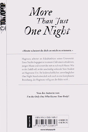 © 2019 Iroha Usui TokyopopFür Hagiwara aus dem Sekretariat der Uni war es der erste One-Night-Stand, für den Studenten Takagi Yuto war es das erste Mal. Hagiwara hat ihn in einem Club aufgesammelt und gleich mit nach Hause genommen. Doch sein Bereuen erfolgt, als er feststellt, dass Yuto ein Erstsemester an seiner Uni ist. Denn von nun an laufen sie sich noch öfters über den Weg. Und die Begegnungen sind für Hagiwara sehr peinlich. Nur verschwommen erinnert er sich daran, dass Yuto in dieser Nacht so etwas angedeutet hat. Aber er war zu betrunken, um sich darum zu kümmern. Und um sich klar daran zu erinnern. Nun macht er Yuto Vorwürfe, dass dieser nicht deutlicher darauf hingewiesen hat, dass er ihn kennt. Yuto hingegen entgegnet, dass es ihn stört, dass die Nacht Hagiwara nichts ausmacht. Ihn hat sie ganz schön mitgenommen. Und er wünscht sich, dass sie den Sex wiederholen könnten, denn er sie passen gut zusammen. Außerdem will er dabei von Hagiwara noch etwas lernen. Immer, wenn sie sich nun auf den Fluren der Uni begegnen, erntet Hagiwara vorwurfsvolle Blicke von Yuto. Er macht sich darüber Gedanken und wird dadurch. Aber schließlich ist es bestimmt nur Yuto, der will, dass sie wieder miteinander schlafen. Aber nachdem er mal wieder von seiner Nacht mit Yuto geträumt hat, hält es Hagiwara nicht mehr aus und fragt Yuto, ob er nicht bei ihm vorbei kommen könnte. Der Manga erzählt, wie es nach einem One-Night-Stand zwischen einem Uniangestellten und einem Studenten weiter geht. Es stellt sich heraus, dass beide nicht ganz ehrlich zueinander waren. Dennoch entwickelt sich zwischen ihnen eine feste Liebesbeziehung. Grafisch ist der Manga durchwachsen. Die Charaktere sind zwar leicht unterschiedlich gestaltet, aber auch nur sehr einfach gezeichnet. Besonders die Gesichter wirken eckig und hölzern, wobei Yuto das etwas größere Gesicht zeigt. Auch die Frisuren sind unterschiedlich gestaltet, wobei die Haarfarbe, Hagiwara ist blond und Yuto schwarzhaarig, das beste Unterscheidungsmerkmal sein dürfte. Insgesamt ist Yuto größer und etwas massiger als Hagiwara. Die Kleidung besteht aus einfachen Hemden und Shirts, die wenig detailliert gestaltet sind. Die nackten Körper sind dagegen gut getroffen und die erotischen Szenen sind unzensiert gezeichnet. Die wenigen Hintergründe des Mangas sind, bis auf die Landschaften am Ende, eher einfach gestaltet. Die Landschaften sind dafür detailreich und sauber umgesetzt. |