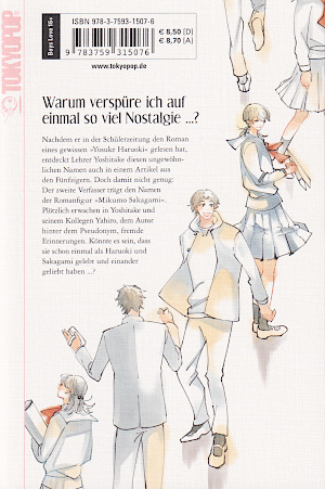© 2017 Dentou Hayane TokyopopYoshitake und Yahiro sind Kollegen an einer Oberschule in der Stadt Yashiki. Eines Tages kommen sie ins Gespräch, weil sich Yoshitake über das seltsame Ende eines Fortsetzungsromans in der Schülerzeitung ärgert. Der Autor Yosuke Haruoki scheint aber unter einem Pseudonym zu schreiben. Doch Yahiro gibt ihm den Tipp, im Archiv im alten Schulgebäude nachzuforschen. Allerdings wird ihre Unterhaltung durch den Schüler Ishimaru gestört, der durch das Fenster geklettert kommt. Eigentlich ist er nur da, um das Klassenbuch abzugeben. Weil er auf dem gleichen Weg verschwindet, wie er gekommen ist, schauen ihm Yoshitake und Yahiro nach. Dabei kommt Yahiro Yoshitake sehr nahe. Den stört das etwas, aber andererseits kommt ihm diese Nähe auch vertraut vor. Als Yoshitake im Archiv feststellt, dass es schon 1956 eine Geschichte von Yosuke Haruoki gab, stellt er die Schülerin Kako zur Rede, die für die Schülerzeitung verantwortlich ist. Es stellt sich heraus, dass hinter den Pseudonym Yosuke Haruoki sein Kollege Yahiro steckt. Er hat nur nichts gesagt, weil ihm die Geschichte peinlich war. Als in dem Augenblick ein Erdbeben das Gebäude erschüttert, drückt Yahiro Yoshitake an sich. Der ist eher verwirrt als überrascht, denn selbst als ein herunterfallender Gegenstand Yahiro leicht am Kopf verletzt, kommt ihm die Situation bekannt vor. Da Yahiro sich wegen ihm verletzt hat, begleitet Yoshitake ihn nach Hause. Dort macht ihn Yahiro in der alten Geschichte noch auf den Namen Mikumo Sakagami aufmerksam. Anscheinend waren Mikumo und Yasuke damals gute Freunde. Weil ihm die ganze Geschichte bekannt vorkommt, fragt sich Yoshitake schließlich, ob es möglich ist, dass er und Yahiro schon früher einmal gelebt haben und dann ein Paar waren. In dem Manga geht es um zwei Lehrer, die sich anscheinend Erinnerungen an ein altes Leben teilen, in dem sie als Schüler ein Paar waren. Durch diese Erinnerungen können sie ihre Gegenseitige Liebe nun fortsetzen. Grafisch ist der Manga in Ordnung. Die Charaktere sind sauber gestaltet. Die Frisuren der Männer ähneln sich etwas, bei den wenigen Frauen gibt es mehr Abwechslung. Allerdings ähneln sich die Gesichter etwas, wobei es kleine Unterschiede gibt, was aber auch daran liegt, dass Yahiro immer etwas melancholisch ist. Insgesamt sind die Emotionen eher unauffällig gezeichnet. Die Kleidung ist sehr einfach umgesetzt. Die Charaktere tragen nur Anzüge, die sehr einfach gestaltet sind. In der einzigen erotischen Szene, die nur leicht zensiert ist, zeigen sie einen guten und nicht übertriebenen Körperbau. Die Gegenstände wie Getränke, Bücher und Papierflieger sind einfach, aber gut erkennbar gezeichnet. Die Hintergründe sind hingegen sehr sauber und detailliert gestaltet, besonders das alte Schulgebäude sieht prächtig aus. |