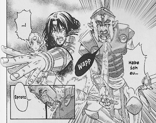 ![]() © 2023 Kousuke Hamada AltraverseDas Königreich Hellenthal wurde ohne Vorwarnung von dem Königreich Iria überfallen. König Cervin wurde mit einer Konferenz aus der Burg gelockt. Durch den Angriff wurde seine ganze Begleitung ausgelöscht. Er selbst konnte verletzt fliehen. Auch in der Burg wurde gewütet. Die Verteidiger, aber auch die Bediensteten wurden getötet. Immerhin findet Cervin noch seine Tochter verletzt vor, da an ihrer Stelle eine Doppelgängerin getötet worden ist. Doch Cervins Frau und Alcinoes Mutter wird getötet und damit passiert das, was Cervin auf jeden Fall verhindern wollte. Denn dadurch wurde der Schattendrache, der unter der Burg schlummerte befreit. Denn Hanna hatte ihn gebannt. Doch nun will Alcinoe ihn bannen. Das Problem liegt darin, dass sie dafür eine wertvolle Erinnerung opfern muss. Eigentlich will sie, wie es ihr befohlen worden ist, die Erinnerung an ihre Mutter opfern, doch Cervin verbietet es ihr. Sie darf diese Erinnerungen nicht verlieren. Statt dessen soll sie die Erinnerungen an ihn opfern. Denn mit ihm kann sie neue Erinnerungen sammeln. Schwer verletzt können Cervin und Alcinoe fliehen. Aber Alcinoe weiß nicht, mit wem sie unterwegs ist, da sie ihren Vater nicht mehr erkennt. Immerhin bekommt sie schnell mit, dass er ein Verbündeter ist. Aber sie kommen in Dörfer, in denen die Truppen von Iria gewütet haben. Da es dort nur wenige feindliche Soldaten gibt, kann König Cervin sie schlagen und die überlebenden Dorfbewohner in Sicherheit bringen. Cervin will nach Avathal fliehen. Er will die Leute dort warnen und dann die Rückeroberung von Hellenthal organisieren. Doch bis da hin ist es ein langer Weg mit vielen gefährlichen, aber auch seltsamen Begegnungen. Der Manga erzählt von dem brutalen Überfall einer Armee aus Untoten und Orks auf ein friedliches Land. Sie wollen die Macht des Drachens nutzen, um gesamte die Welt zu erobern. Alcinoe ist mit einem ihr Unbekannten unterwegs, von dem alle sagen, dass er ihr Vater ist. Gemeinsam hoffen sie aber, dass sie gemeinsame Erinnerungen in guten Zeiten finden. Grafisch ist der Manga gelungen. Die Charaktere sind detailliert und sauber an ihre Rolle angepasst. Auch Nebencharaktere sind gut getroffen. Die Haare sind fein und abwechslungsreich gestaltet. Auch die Gesichter sind unterschiedlich gezeichnet und mit Falten und Bärten individuell dargestellt. Die Emotionen sind allerdings eher einfach geraten. Die Charaktere tragen entsprechend ihrer Rolle unterschiedliche Kleidung. Die Männer tragen oft Rüstungen, Alcinoe ein verziertes Gewand, während das normale Volk nur einfache Kittel trägt. Die Rüstungen sind sehr detailreich gezeichnet. Die Stoffkleidung wird eher einfach dargestellt, sie werden mit Falten und Schattierungen eher selten etwas plastischer gezeigt. Die Gegenstände wie Waffen, Schriftrollen oder Masken sind sind sauber und detailreich gestaltet. Die Untoten und orkischen Angreifer sind ordentlich gezeichnet. Die Kämpfe gegen sie sind brutal und blutig. Auch abseits der Kämpfe werden brutale Szenen gezeigt, sei es nach Hinrichtungen oder bei Wiederbelebungen. Als Kontrast dazu gibt es auch erotische Szenen, bei denen viel gezeigt wird. Tiere wie Bären, Pferde, aber auch der Schattendrache sind sehr sauber gezeichnet. Beim Drachen spürt man die Macht, die von ihm ausgeht. Auch die Hintergründe sind gut getroffen. |