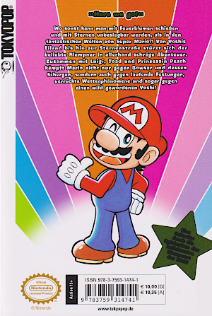 ![]() © 2023 Yukio Sawada TokyopopDieser Manga erzählt von den ersten Abenteuern von Super Mario. Um das Flair zu erhalten, werden auch die damaligen Reklamen unübersetzt beibehalten. Außerdem ist das Papier bei einigen Geschichten künstlich auf alt gefärbt. Die erste Geschichte, „Marios großer Auftritt!!“ stammt aus dem ersten Band von 1991. Es beginnt damit, dass Mario und Luigi auf Yoshis Eiland von Bowser erfahren, dass er eines Morgens Prinzessin Peach entführt hat. Um sie zu retten, sollen sie zu seinem Schloss kommen. Aber Peachs Rettung könnte noch etwas dauern, denn Mario hat Hunger. So will er sich ein großes Ei in die Pfanne hauen, in dem aber Yoshi eingesperrt war. Bowser hat ihn und seine Freunde in die Eier verwandelt. Doch noch während sie sich stärken, werden sie von Koopalingen angegriffen. Während Yoshi sie frisst und so stärker wird, erschlägt Mario einen von denen und erhält eine Feder. Diese verwandelt sich in ein Cape, mit dem er durch die Luft gleiten kann. Aber danach geht es frisch gestärkt in die nächste Röhre. Diese Geschichte ist die längste Geschichte des Bandes und umfasst ungefähr die Hälfte der Seiten. Mario, Luigi und Yoshi kämpfen sich durch Bowsers Schergen bis zu dessen Schloss, wobei ihnen meistens Glück und Yoshis Verfressenheit helfen. In dem Schloss können sie zwar Prinzessin Peach retten, aber es ist doch nur das bekannte Ende. Die weiteren Abenteuer, die dann auf weißem Papier gedruckt sind, sind etwas chaotische Kurzgeschichten. So wird Yoshi ausgenutzt und schließt sich deshalb beinahe Bowser an. Aber Mario trifft dafür auch Wario und Toad. Und immer wieder sind es Bowsers Schergen, die für spannende, aber auch lustige Momente sorgen. Grafisch ist der Manga auf seine Art in Ordnung. Dass die Zeichnungen älter sind, merkt man ihnen zwar nicht so an, aber der Manga ist sehr einfach und kindgerecht gezeichnet. Dafür sind die Charaktere, sowohl die Guten als auch die Bösen, gut erkennbar. Allerdings sieht Luigi in der erste Geschichte wie Mario aus und unterscheidet sich von ihm in der SW-Fassung nur durch das L auf der Mütze. Erst später wird er durch Wario ersetzt und bekommt sein schlankeres Aussehen. Etwas negativ ist, dass die späteren Geschichten von den Figuren her etwas überfrachtet wirken. Dadurch werden die Geschichten eher unüberschaubar. Aber wer die Spiele gespielt hat, wird hier auch verschiedene Szenen wiederentdecken. |