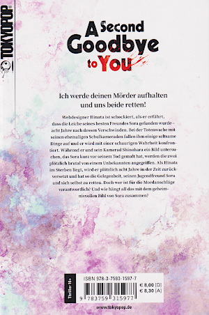 © 2022 Takomaru Takogawa / Tomo Tanaka TokyopopHinata Harusawa war früher im Kunstclub der Schule nur ein mittelmäßiger Maler. Aber er hatte mit Sora Otonashi einen Freund, der ihn immer freundlich kritisierte und ihm dadurch sehr half. Doch auf einmal verschwand Sora und hinterließ nur eine Nachricht, dass er die Welt bereisen wollte, um sich zu verbessern. Acht Jahre später ist Hinata ein mittelmäßiger Webdesigner geworden. Er vermisst Sora, da ihm dessen Tipps und Expertise fehlen. Da erhält er überraschend einen Anruf von Ryosuke Shinohara, einem anderen ehemaligen Klubmitglied des Kunstklubs. Man hat Soras Leiche gefunden. Auf der Beerdigung von Sora herrscht eine seltsame Stimmung, bei der die Mitglieder des ehemaligen Kunstklubs im Mittelpunkt stehen. Hinata kann sich die Stimmung nicht erklären. Aber immerhin trifft er die Klubpräsidentin Marina Hase und den Vizepräsident Sho Tokiwa. Durch ein zufällig belauschtes Gespräch der beiden erfährt Hinata aber, dass man Soras Leiche eingemauert in der Wand des Kunstklubs gefunden hat. Sie stecke dort anscheinend seit dem Zeitpunkt seines angeblichen Verschwindens. So stehen alle ehemaligen Mitgliedes des Klubs plötzlich unter Mordverdacht. Weil Hinata sich unwohl fühlt, sucht er ein leeres Zimmer aus, um sich auszuruhen. Dort entdeckt er überraschend das Gemälde, an dem Sora kurz vor seinem Verschwinden gearbeitet hat. Auch Ryosuke kommt dazu. Als Hinata kurz den Raum verlässt, wird Ryosuke allerdings erschlagen. Und auch Hinata wird angegriffen. Als Hinata wieder zu sich kommt, befindet er sich allerdings plötzlich im Kunstklub acht Jahre früher. Und er entdeckt Sora, der an seinem Gemälde malt. Durch einen Kalender an der Wand erfährt er, dass er ein halbes Jahr Zeit hat, bis Sora verschwindet. Der Manga ist ein Krimi, bei dem Hinata einen Mord verhindern muss. Ein erster Verdacht wird von Sora selber schnell ausgeräumt. Doch dann muss Hinata feststellen, dass seine Aktionen die Realität brutal ändern können. Grafisch ist der Manga in Ordnung. Die Charaktere sind sauber und unterschiedlich, aber auch etwas einfach gestaltet. So sind die Frisuren zwar detailliert gezeichnet, aber auch etwas flächig eingefärbt. Die Gesichter sind einfach dargestellt und sehen sich ähnlich. Doch sie können ihre Gefühle gut ausdrücken. Als Kleidung tragen die Jungs Anzüge oder nur Hemden. Hase zeigt sich mit detaillierteren Kleidern, die mit Rüschen verziert sind. Bei Taten werden die Charaktere auch schwer verletzt, wodurch es zu sehr blutigen Wunden kommen kann. Die Gegenstände wie die Malutensilien sind sauber gestaltet. Die Hintergründe sind detailliert gezeichnet. |