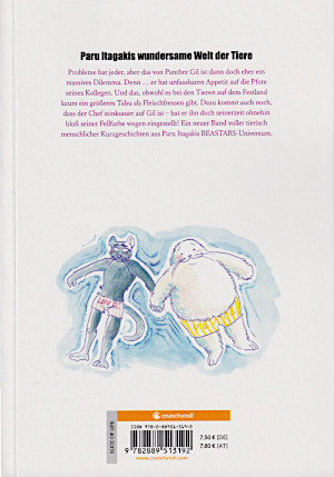 © 2018 Itagaki Paru CrunchyrollIn dem Manga sind Kurzgeschichten aus dem „Beastars“-Universum. In der Geschichte „Der Löwe und der Flughund“ ist der Löwe Raul der Schulsprecher. Allerdings über er gerade für die Abschlussprüfung und hat daher kaum Zeit. So ärgert er sich auch darüber, dass er in der Schule ständig mit Anfragen belästigt wird. Aber die Bitte von einem der Lehrer, kann er nicht ablehnen. Er soll seinen Mitschüler, den Flughund Azumu, finden und bis zum Abschluss wieder zur Schule bringen. Aber als Raul Azumu findet, wirft der ihm vor, ein brutaler Killer zu sein. Denn Azumus Eltern wurden vor seinen Augen von Löwen gefressen. Das Wissen erschüttert Raul ebenso wie der Vorwurf von Azumu, dass er ihn töten will. Um sich mit Azumu anzufreunden, beginnt Raul damit, ihm den verpassten Stoff beizubringen. So langsam gewöhnen sie sich aneinander. In der zweiten Geschichte, „Der Tiger und der Biber“, sind der Tiger Gon und der Biber Mog beste Freunde. Allerdings bekommen sie mit, wie eine Gruppe älterer Fleischfresser einen Pflanzenfresser überfällt und ausraubt. Da Gon befürchtet, dass ihnen eines Tages das gleiche Schicksal drohen wird, beschließt er etwas zu tun. So holt er einen Fotoapparat und will den Überfall dokumentieren. Da dabei der Blitz des Fotoapparates ausgelöst wird, werden sie allerdings bemerkt. So beginnt eine Verfolgungsjagd zum Büro des Direktors. Auch in den weiteren Geschichten geht jeweils es um die Beziehung zwischen einem Fleischfresser und einem Pflanzenfresser. Es geht um Freundschaft, eventuell Liebe, aber auch um fressen und gefressen werden. Und auch wenn sie sich fürchten, müssen sie zusammen leben und auch im Beruf miteinander auskommen. Grafisch ist der Manga dabei sehr gelungen. Die Charaktere sind etwas schräg, aber erkennbar gestaltet. Da es um viele verschiedene Tierarten geht, lassen sie sich auch meistens gut auseinander halten. Aber auch Tiere der gleichen Art sind erkennbar unterschiedlich gestaltet. Die Tiere haben ihre Gefühle, aber mit ihren teilweisen steifen Gesichtern, lassen sie diese nur schwer ausdrücken. Dennoch können sie gut erahnt werden. Die Kleidung ist so unterschiedlich wie die Tiere selber. Die Schüler tragen Schuluniformen, andere Tiere einfache Freizeit- oder Berufskleidung. Gegenstände und Hintergründe sind einfach, aber gut erkennbar gestaltet. |