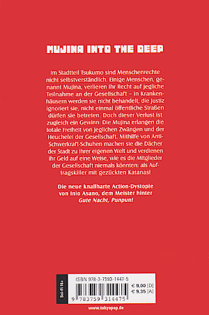© 2023 Inio Asano TokyopopIn der Welt hat sich eine Rooftop-Culture etabliert, deren Mitglieder sich Mujina nennen. Sie sind Ausgestoßene, Kriminelle oder einfach nur Leute, die gegen die Gesellschaft rebellieren. Sie leben auf den Dächern, um den Kameras der Polizei zu entgehen. Denn wenn sie entdeckt werden, werden sie gejagt. Da sie aber auch Geld verdienen müssen, arbeiten einige von ihnen als Killer oder lassen sich als Leibwächter anheuern. Die Mujina Tenko geht aber noch einen Schritt weiter. Sie verdient ihr Geld, indem sie als Influencerin ihre Abenteuer streamt. Aber zu ihren Jobs gehören auch Auftragsmorde. Ihr aktuelles Ziel ist der Manager des Songwriters YASUO von den Jersey Devils. Der organisiert für YASUO immer unschuldige Minderjährige und hat auch noch weitere Machenschaften am Laufen. Weil eine Zeitschrift das herausgefunden hat, soll er sterben, bevor der Artikel erscheint. Allerdings lässt sich der Manager von Ubume, einer legendären Mujina, schützen. Doch Tenko verletzt sie schwer und töten den Manager, bevor sie verschwindet. Da es gleich von Polizisten wimmeln wird, flieht auch Ubume und nimmt Juno Oshima, YASUOs Opfer mit sich. Bei Straßendoc, der Ubumes Wunde versorgt, treffen sie auf Terumi Morgan. Der produziert einfache Computerspiele. Vor kurzem hat seine Mitarbeiterin Nakamatsu angefragt, ob sie nicht ein Spiel über die Mujina machen könnten. Er hat es zwar abgelehnt, aber sich dennoch damit beschäftigt. Und nun ist er fasziniert von dieser freien Welt. So beschließt er, Ubume und Juno zu helfen.Wobei es am Ende Ubume ist, die alles regeln muss. Der Manga handelt von dem Leben in einer korrupten Welt. Während die normalen Bürger nichts mitbekommen, handeln viele Reiche so, wie es ihnen passt. Mit Geld können sie alles Regeln. Und sei es, Mujinas zu beauftragen, ihre Probleme zu beseitigen. Ubume ist schon lange dabei und könnte sich auch zur Ruhe setzen. Aber ein Kindheitstrauma treibt sie weiter an. Grafisch ist der Manga sehr gelungen. Die Charaktere passend und unterschiedlich gestaltet. Sie haben individuelle Frisuren und Gesichter, die allerdings teilweise etwas schräg aussehen. Auch die Kleidung ist unterschiedlich gestaltet. Viele tragen Geschäftsanzüge, aber einige der Mujina zeigen auch so ihre Außenseiterrolle. Aber sie wirken mit den Falten plastisch und passen gut zu den Posen. Bei einigen Frauen ist die Kleidung auch erotisch angehaucht. Dazu kommt, dass in dieser Welt Sex alltäglich ist, entweder gegen Geld oder aus Machtgefühlen heraus oder manchmal auch nur aus Lust. Allerdings sind die Szenen gut integriert, dass sie nicht störend wirken. Die Kämpfe mit Katanas sind schnell und brutal. Dabei werden auch oft Sprungstiefel für Angriffe von oben eingesetzt. Gnade gibt es bei ihnen kaum. Es werden auch abgeschlagene Körperteile gezeigt, aber ohne wirkliche Splattereffekte. Gegenstände und Hintergründe sind sauber und sehr detailreich gezeichnet. |