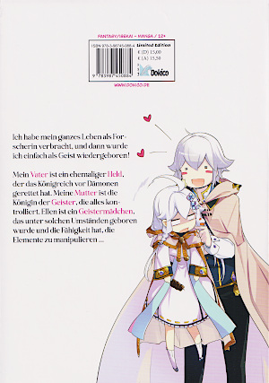![]() © 2019 Yutaka Ohhori / Matsuura DokicoDas Königreich Tenbahl lebte in friedlichen Zeiten, bis es von einer Dämonenarmee angegriffen wurde. Rovel Vankreift war damals der beste Magier, der mit seinem Geist große Magie erschaffen konnte. Allerdings fiel der Heerführer, Rovel Vater, und Rovel selbst wurde von seinem Geist in die Geisterwelt getragen, nachdem er die Dämonenarmee mit allerletzter Kraft besiegen konnte. Seitdem sind zehn Jahre vergangen. Nun läuft ein Vater mit seiner achtjährigen Tochter Ellen durch die Stadt, die die Kraft besitzt, alles Materielle zu reparieren oder herbeizuzaubern. Denn Ellen war in ihrem früheren Leben eine Wissenschaftlerin, die sich auf die Erforschung neuer Materialien spezialisiert hatte. Ihr Vater, der niemand anderes als Rovel ist, hat sie in der Geisterwelt mit seinen Geist, der Königin der Elementargeister Origin, bekommen. Mittels Teleportmagie können sie die Grenzen zu ihrer Welt überwinden. Dieses Mal werden sie allerdings von Albert, Rovels ehemaligen Diener erkannt. Der bittet Rovel, nach Hause zu kommen, um seinem Bruder Sauvel zu helfen. Denn die „Frau“ ist anwesend. Als Rovel das hört will er erst recht nicht heimkehren. Erst Ellen erinnert ihn daran, dass er seiner Familie helfen muss. Um sich zu schützen, heiratet Rovel Origin noch schnell in der örtlichen Kathedrale. Dann schickt er sie und Ellen zurück in die Geisterwelt. Denn der „Frau“ sollen die beiden nicht begegnen. Die „Frau“ ist nämlich Agielle, die zweite Prinzessin des Reiches. Und sie hat schon damals geschworen, Rovel zu heiraten. So hat sie sich einfach bei den Vankreifts einquartiert und sehr herrschsüchtig und verschwenderisch gelebt. Wie Albert Rovel erzählt, scheint sie nach seinem Verschwinden Sauvel geheiratet zu haben. Tatsächlich empfängt Agielle Rovel in der heimatlichen Burg. Sie findet nicht nur, dass sie nun heiraten könnten, sondern stellt ihm auch noch ihre Tochter Amielle als die seinige vor. Rovel ist entsetzt, zumal Agielle, die schon damals keine Schönheit war, in den letzten Jahren sehr fett wurde. Und Amielle kommt sehr ihrer Mutter nach. So ist dieser Manga kein gewöhnlicher Fantasiemanga. Denn auch wenn Magie, Geister und Kriege eine Rolle spielen, geht es mehr um höfische Intrigen. Dank ihres Wissens um die Elemente schafft es Ellen, sich auch als Kind in diese Welt der Erwachsenen einzumischen. Dadurch gerät sie allerdings auch in das Visier dunkler Mächte. Grafisch ist der Manga in Ordnung. Die Charaktere sind unterschiedlich und ordentlich gestaltet. Die Frisuren sind etwas einfach, aber sehr abwechslungsreich gestaltet. Die Gesichter wirken etwas einfach, wobei dennoch die detailliert gezeichneten Augen auffallen. Die Emotionen werden aber fein dargestellt. Als Kleidung tragen die Frauen opulente Kleider, die ihre Figur betonen. Männer tragen hingegen einfachere Kleidung. Allerdings sind einige Uniformen auch mit Knöpfen und Borten reich verziert. Die Gegenstände sind sauber und detailreich gezeichnet. Magie wird mit einem magischen Kreis und schwebenden Gegenständen dargestellt. In Ellens Fall werden auch noch die zu bearbeitenden Elemente gezeigt. Auch die Hintergründe sind sauber und detailliert gestaltet. |