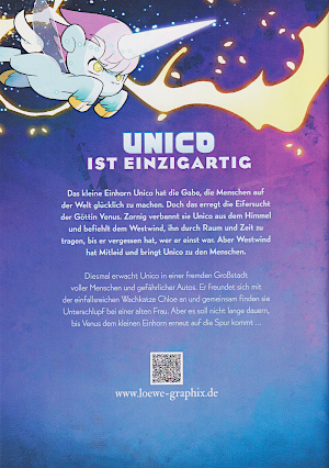 ![]() © 2024 Gurihiru / Samuel Sattin Osamu Tezuka Loewe MangaAls die Götter die Welt erschufen, brachten sie auch Einhörner als einzigartige Wesen hervor. Denn diese konnten zwischen der Götterwelt und der Menschenwelt wechseln. Ein Einhornfohlen, Unico, war allerdings neugierig und verirrte sich in den Garten von Psyche. Diese fand Gefallen an dem Fohlen und sie spielten zusammen. Dadurch bekamen aber die Menschen die Fähigkeit, Neues zu erfinden. Die Göttin Venus wurde daraufhin eifersüchtig auf die Menschen. Als ihre Spione herausfanden, dass Unico dahinter steckt, befahl sie, dass Einhorn zu beseitigen. Ihre Dienerin Zephyrus, die Göttin des Westwinds, sollte Unico durch die Zeit tragen, bis sich niemand mehr an ihn erinnert. Doch Zephyrus hat Mitleid mit Unico. So lässt sie ihn ab und zu bei den Menschen, damit er sich dort erholen kann. Doch jedes mal vergisst Unico, wer er ist und was er bei den Menschen soll. Weil Zephyrus schließlich Mitleid mit ihm hat, wacht Unico schließlich in einer modernen Stadt auf. Weil Unico wieder nicht weiß, wer und wo er ist, flieht er vor den Menschen, die sich um ihn kümmern wollen. Er wird von der Katze Chloe gefunden, die sich um ihn kümmert und mit nach Hause nimmt. Als Chloe es schafft, Unico zu beruhigen, schläft er ein. Doch durch seine Träume wird Venus wieder aufmerksam, die Zephyrus ruft. Chloe wird allerdings ausgesetzt. So kommen sie und Unico bei einer alten Frau im Wald unter. Die Idylle wird aber von einem Jäger gestört, der in der Nähe wohnt und nur wegen der Trophäen Tiere tötet. Weil Venus in Gestalt von Zephyrus wieder hinter Unico her ist, bleiben ihm und Chloe nicht viel Zeit, sich um die Probleme der alten Dame zu kümmern. Der Comic erzählt die etwas traurige Geschichte eines jungen Einhorns, dass durch die Zeit entführt wird. Es hat immer nur kurze Zeit, Freunde zu finden und ihnen zu helfen. In der Zwischenzeit versucht Zephyrus, Unico vor der Venus zu beschützen. Die Rahmenhandlung wurde von dem gleichnamigen Manga von Osamu Tezuka übernommen, wobei die einzelnen Abenteuer neu gestaltet wurden. Die Geschichte für Kinder lässt sich leicht lesen, auch wenn einige Szenen etwas brutal wirken. Grafisch ist der Comic sehr gut. Die Charaktere sind etwas einfach, aber gut getroffen. Sie passen gut zu den Rollen, die sie darstellen. Die göttlichen Wesen sind einfach und teilweise ohne Gesicht dargestellt. Menschen hingegen sind unterschiedlich gestaltet. Ältere Menschen haben sehr individuelle Gesichtszüge. Die Kleidung ist unterschiedlich gestaltet, aber nur einfach gezeichnet. Die handelnden Tiere und auch Unico sind auch einfach, aber auch individuell gestaltet. Als Nebencharaktere sind sie aber auch detaillierter umgesetzt. Magie wird hauptsächlich durch Strahlen dargestellt. Kämpfe sind spannend gestaltet und dynamisch umgesetzt. Gegenstände sind gut erkennbar. Die Hintergründe sind sauber und detailliert gezeichnet. |
