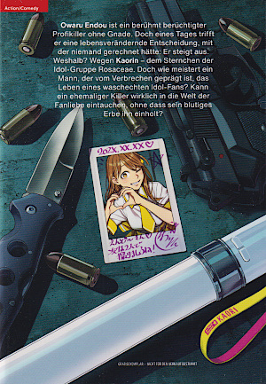 © 2023 Rintarou Ooshima Planet MangaOwaru Endou ist einer der besten Auftragskiller. Er arbeitet für die Verbrecherorganisation Fujiyama-Kai und schon sein Name ist in der Unterwelt gefürchtet. Denn er erledigt seine Aufträge schnell, sicher und präzise. Das Aufräumkommando, dass hinter ihm die Leichen beseitigt, verehrt ihn inzwischen als eiskaltes, unerschütterliches Idol. Doch privat ist Endou ganz anders. Er verehrt die Sängerin Kaori Minaboshi der Idolgroup Rosaceae, die er Kaorin nennt, abgöttisch. Eines Tages kommt er zu einem Meet and Greet mit Kaorin und stellt fest, dass er ihr nicht seine blutbesudelte Hand reichen kann. Das würde sie beschmutzen. So kündigt Endou kurzerhand seinen Job persönlich bei Hideyoshi Fujiyama im Fujiyama-Tower. Fujiyama akzeptiert die Kündigung, ist aber nicht sehr erfreut darüber. Endou beginnt daraufhin in einem Schnellrestaurant zu arbeiten. Denn er will nicht, dass er Kaorin mit seinem blutigen Geld beschmutzt. Alles Geld, was er für sie ausgibt, soll durch normale Arbeit verdient werden. Er muss sich anstrengen, denn demnächst steht das erste Solokonzert von Rosaceae an, zu dem er unbedingt gehen muss. Allerdings wird Kaorin vor dem Konzert entführt. Die Entführer wollen Kaorins Vater, den Premierminister Minabishi, erpressen. Sie haben früher öfters für ihn gearbeitet, aber seit er Premierminister geworden ist, will er nichts mehr von ihnen wissen. Zu spät erfahren sie, dass Endou zu Kaorins größten Fans zählt. So verpasst er zwar fast das Konzert, aber die Gang wird ihr keine Schwierigkeiten mehr machen. Aber dann überrascht Kaorin Endou mit der Neuigkeit, dass sie für die Band ein T-Shirt kreiert hat. Und sie bittet ihn, sich als ihr Fan von seinem Anzug zu trennen und ihr Shirt zu tragen. Kaorin ahnt nicht, dass das eine schwere Entscheidung für Endou ist. Denn der Anzug ist nicht nur seine Kleidung, er ist auch für den Job des Hitman gedacht. So ist er gegen jede Waffe gepanzert und in den vielen kleinen Taschen kann Endou unauffällig seine Waffen verstauen. Ohne seinen Anzug fühlt er sich nackt. Doch als Endou es schafft, in T-Shirt zu Kaorins Konzert zu gehen, fühlt er sich auf einmal leicht und frei. Denn er hat übersehen, dass der Anzug mit der Panzerung und den Waffen viel wog. So nutzt er das aus und feuert Kaorin wie wild an. Aber er muss feststellen, dass er damit sehr übertreibt. Immerhin schafft Endou es, sich mit Yoshida, der Koume Yamamoto aus Rosaceae verehrt, anzufreunden. In dem Manga geht es um die Wandlung eines Profikillers zu einem normalen Fan eines Popsternchens. Dabei stellt er fest, dass es nicht einfach ist, sein Verhalten zu ändern. Aber wenn Kaorin ihn um etwas bittet, muss er ihrer Bitte nachkommen. Und er hat noch viel zu lernen, was es bedeutet, ein echter Fan eines Idols zu sein. Grafisch ist der Manga gelungen. Die Charaktere sind detailliert und abwechslungsreich gezeichnet. Endou ist als brutaler Killer gut gestaltet, aber als Fan einer jungen Frau muss er weicher werden. Die Gesichter und Frisuren sind sauber und unterschiedlich gestaltet. Die Emotionen sind gut getroffen, nur Endou wirkt teilweise sehr düster. Auch die Kleidung ist gut gestaltet. Kaori und die anderen Mitglieder von Rosaceae tragen detailreich gezeichnete Kleider, während der schwarze Anzug von Endou mit seinen Falten gut gestaltet ist. Auch andere Kleidung wie die Shirts sind detailliert umgesetzt. Gegenstände wie die Leuchtstäbe, die Idol-Karten, Kameras oder einfach nur Brot sind ebenfalls sauber gezeichnet. Die Kämpfe sind sehr dynamisch, wobei sie nach seinem Ausscheiden aus der Yakuza nicht mehr so blutig sind. Unter anderen deshalb, weil Endou nun mit Leuchtstäben kämpft. Die Hintergründe sind ebenfalls gut getroffen. |