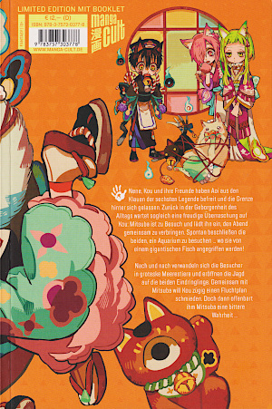 ![]() © 2015 Iro Aida Manga CultDie Schülerin Nene Yashiro ist unsterblich in Teru, einen Schüler aus der 11.Klasse verliebt. Doch der weißt sie zurück. Da hört Nene von den sieben Legenden der Akademie. Die Legende besagt, dass man auf einem bestimmten Mädchenklo den Geist Hanako beschwören kann. Er erfüllt dem Mädchen einen Wunsch, nimmt ihr aber auch etwas sehr Kostbares. Doch Nene ist zu verliebt, um sich zu fürchten. So ruft sie Hanako und der Geist erscheint tatsächlich. Allerdings entpuppt sich Hanako als ein männlicher Geist. Er will Nene zwar ihren Wunsch nach Liebe erfüllen, hat aber keine Ahnung, wie er es anstellen soll. So versucht es Hanako mit Tipps aus einem alten Ratgeber. So soll Nene die Liebe über ihre Talente finden. Doch das Einzige, was sie gut kann, ist Gärtnern. Und es stellt sich heraus, dass Teru kein Gemüse mag. Da verliert Hanako eines Tages einen kleinen Beutel. Darin sind zwei Kekse. Nene ist einen davon, auch wenn Hanako sie noch warnen will. Den die Kekse sind eigentlich zwei Schuppen einer Meerjungfrau. Wer eine Schuppe isst, wird verflucht. Ist noch ein Zweiter eine Schuppe, werden beide unzertrennlich. Eigentlich freut sich Nene darüber, doch dann kann sie Teru nicht dazu bringen, die zweite Schuppe zu essen. So wird sie verflucht und in einen Fisch verwandelt, die der Meerjungfrau gehört. Doch Hanako will Nene nicht der Meerjungfrau überlassen. So schluckt er kurzerhand die zweite Schuppe und bindet Nene so an sich. In dem Manga geht es darum, dass Nene mehr oder weniger unfreiwillig die Sieben Legenden der Akademie erforscht. Allerdings steht sie dabei unter der Fuchtel von Hanako, der ausnutzt, dass sie ihm gehorchen muss. Allerdings hat Hanako auch eigene Geheimnisse. Grafisch ist der Manga recht gut. Die Charaktere sind klar, aber manchmal etwas unförmig gezeichnet. Besonders Nene ist sehr fein und detailliert dargestellt. So kann sie auch gut ihre Gefühle zeigen. Die Schuluniformen der Mädchen ist sehr aufwendig, die Schuluniformen der Jungs ist viel einfacher gezeichnet. Gegenstände sind klar und detailliert gezeichnet. Die Yokai sind teilweise einfach und teilweise sehr imposant gezeichnet. So sind sie auch nur teilweise furchterregend. Die Hintergründe sind einfach, aber manchmal voller Details. |