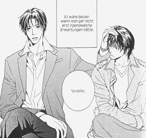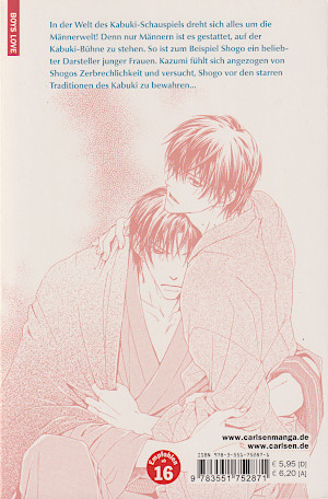 ![]() © 2008 Ren Kitakami Carlsen VerlagKazumi und Shogo sind Cousins und bei einem Kabuki-Theater als Schauspieler unter Vertrag. Zur Schauspielerei kamen sie durch Shogos Vater Ikuomi. Shogo kennt ihn aber auch nur als Kabuki-Lehrer. Um in der Nähe seines Vaters zu sein, hat er sich immer besonders bei den Schauspielstunden mit seinem Vater angestrengt. Doch nun muss Shogo erfahren, dass sein Vater ihn außerhalb der Stunden so kalt behandelt hat, weil er nicht sein Sohn ist. Shogos wirklicher Vater ist Masahiro, sein Onkel und Kazumis Vater. Schlimmer wird es aber noch, als er erfährt, dass Kazumi dieses Geheimnis schon länger kannte. Nun versteht Shogo zwar seinen Vater, der schließlich das Kabuki verließ, aber in ihm ist nun diese Leere, so dass er selber nicht weiß, wie es mit ihm weitergehen soll. Schließlich kennt er nur das Theater und Kazumi war bis dahin sein bester Freund. Da erhält er von seinem Manager Munechika ein neues Angebot. Insgesamt ist der Manga aber sehr langatmig und vorhersehbar. Auch grafisch kann der Manga nicht überzeugen. Das Charaktere sehen sich sehr ähnlich und sind einfach gezeichnet. Schlechte Aufteilung der Panels und der Sprechblasen unterstützen die Verwechslungsgefahr. |