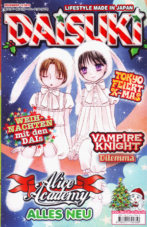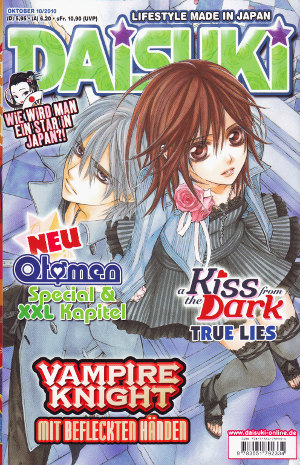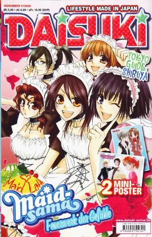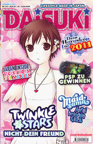 Die "Daisuki" (gesprochen "Daiski" auf Deutsch: "Ich hab dich lieb!") ist das Schwestermagazin zur "Banzai!". Wobei Schwestermagazin die richtige Wortwahl ist. Denn während die "Banzai!" Shonen-Mangas enthält, sind es in der "Daisuki" Shojo-Mangas, also Mangas, die speziell für Mädchen gezeichnet worden sind. Außerdem sind aller Serien vom japanischem Verlag Hakusensha. Auf ca. 250 Seiten können so fünf Manga-Serien gleichzeitig laufen. Dazu kommen noch Tipps und Trends zu Musik und Mode aus Japan und ein kawaii Maskottchen. |