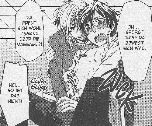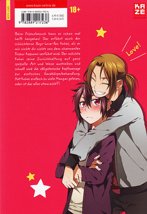 ![]() © 2012 Yuo Yodogawa KAZÉ MangaDieser Band enthält mehrere erotische Kurzgeschichten von Yuo Yodogawa. In der ersten Geschichte lässt der Schüler Kohei Arima sein Haar lang wachsen, weil er Angst vor der Berührung von Fremden hat. Aber als sein Haar zu lang wird, bringt ihn sein Freund Hiroki Takamine zum Friseur Kazuomi Shiba. Dieser verpasst Kohei nicht nur eine Kopfwäsche und einen Haarschnitt, sondern auch eine Kopfhautmassage. Als Kazuomi mitbekommt, dass Kohei Shonen-Ai-Mangas als Hobby hat, massiert er ihm auch die unteren Regionen. Koheis Bruder Kanata hat in der Zwischenzeit auch so seine Probleme. Denn er hat ein Versprechen gegenüber seiner Zwillingsschwester Ichika gebrochen. Als Strafe sitzt er nun in ihrer Kleidung in ihrer Klasse. Leider hat ihr Lehrer, Kyogo Mimisaka, beschlossen, ausgerechnet heute die Taschen zu kontrollieren. Und so findet er in Kanatas Tasche einen kleinen Vibrator, den Ichika dort hineingeschmuggelt hat. Irgendwie erregt es Kanata aber. So muss er auf die Toilette, wohin ihm aber Kyogo folgt. Da Kanata gerade dabei ist, sich abzureagieren, hilft ihm Kyogo auf seine Weise. Und behält das Höschen von Ichika, woraufhin diese von Kanata verlangt, es zurückzuholen. Als sich Kohei und Kanata mit ihren Liebhabern in der Stadt treffen, müssen sie feststellen, dass Kazuomi und Kyogo sich kennen. Und Kazuomi schlägt einen erotischen Wettkampf vor. Auch wenn die erotischen Szenen nicht explizit sind, so drehen sich die Geschichten nur um Sex, Denn sowohl Kazuomi als auch Kyogo sind beide leicht pervers. Außerdem enthält der Manga weitere Geschichten dieser Art. Grafisch ist der Manga in Ordnung. Die Charaktere sind ordentlich und abwechslungsreich gezeichnet. Die Charaktere sind dabei ziemlich emotional und tragen auch unterschiedliche Kleidung. Die Zeichnungen sind dabei sauber gezeichnet. |