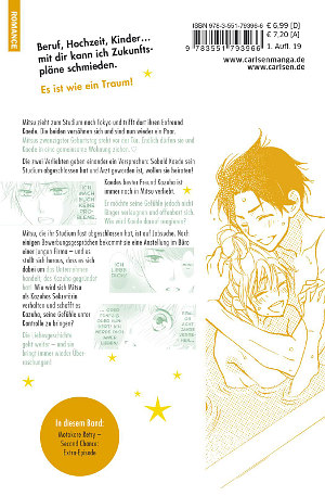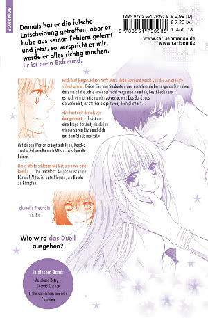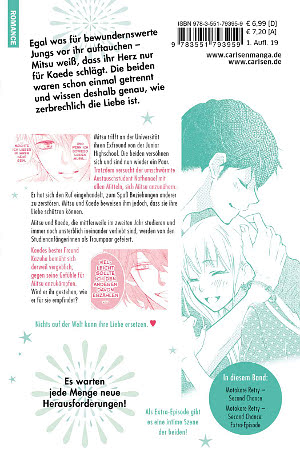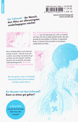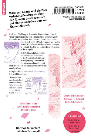 ![]() © 2015 En Hanaya Carlsen VerlagDie junge Studentin Mitsu freut sich auf ihr neues Leben in Tokio und an der Futatsubashi-Universität. Ihr wurde von der Universität ein Zimmer vermittelt und sie ist nun unterwegs, ihre neuen Nachbarn kennen zu lernen. Doch gleich der erste Nachbar neben ihr ist Kaede Hirako, Mitsus bisher einziger Freund. Nach einer Liebe in der Mittelstufe hat er sich von ihr getrennt, um sich mehr seinem Basketball-Spiel widmen zu können. Mitsu muss erkennen, dass Kaedes Lächeln immer noch unwiderstehlich ist. Außerdem ist er in der Zwischenzeit männlicher geworden. Mitsu ist noch verwirrt, als ein Mädchen, Nina, aus Kaedes Wohnung kommt und fragt, wo er bleibt. Am nächsten Tag trifft Mitsu Kaede an der Uni. Da beide gleichzeitig Schluss haben, fahren sie gemeinsam nach Hause. So kommt es, dass sie beide plötzlich bei Kaede in der Küche stehen und gemeinsam kochen. Dabei stellt sich heraus, dass sie immer noch viel aneinander denken. So traut sich Mitsu schließlich, Kaede nach Nina zu fragen. Doch die ist für ihn nur eine normale Freundin. Und ehe es Mitsu so richtig mitbekommt, liegt sie in Kaedes Armen und sie küssen sich. Doch dann bricht Kaede den Kuss ab. Denn eigentlich wollte er nur, dass sie sich wieder in ihn verliebt, damit er mit ihr Schluss machen kann. Denn ihre Trennung damals war nur ein Missverständnis und sehr schmerzhaft für ihn. So soll nun Mitsu vor seinen Augen leiden. Doch als Mitsu am nächsten Tag einen Aufreißer mit nach Hause nehmen will, ist es Kaede, der sie vor ihm rettet. Gemeinsam stellen sie fest, dass sie trotz allem immer noch tiefe Gefühle füreinander haben. Und deshalb wollen sie es noch einmal miteinander versuchen. Mitsus Freundin Non-chan ist davon allerdings weniger begeistert. Sie misstraut Kaede. So will sie die neue Liebe zwischen Mitsu und Kaede nur akzeptieren, wenn ihr Kaede seinen Freund Kazuha vorstellt. Der Manga ist eine etwas andere Liebesgeschichte. Denn Mitsu und Kaede lieben sich, aber zwischen ihnen stehen die Jahre der Trennung. Vor allem Nina, die zwischenzeitlich Kaedes Freundin war, erinnert Mitsu immer wieder daran. Grafisch ist der Manga in Ordnung. Die Charaktere sind abwechslungsreich gezeichnet und können gut ihre Gefühle zeigen. Auch die Umsetzung der Vergangenheit ist gelungen, die Jugendlichen sind wiederzuerkennen. Kleidung und Körperhaltung sind passend zur Situation gewählt und machen die Charaktere locker. Ein wenig negativ sind nur einige Nahaufnahmen. Die Hintergründe bestehen größtenteils aus Rasterfolie, aber es gibt auch sehr detailliert Hintergründe. |