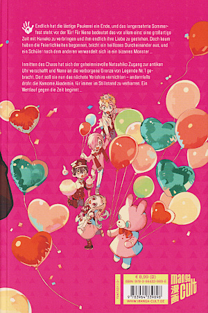 © 2015 Iro Aida Manga CultDie Schülerin Nene Yashiro ist unsterblich in Teru, einen Schüler aus der 11.Klasse verliebt. Doch der weißt sie zurück. Da hört Nene von den sieben Legenden der Akademie. Die Legende besagt, dass man auf einem bestimmten Mädchenklo den Geist Hanako beschwören kann. Er erfüllt dem Mädchen einen Wunsch, nimmt ihr aber auch etwas sehr Kostbares. Doch Nene ist zu verliebt, um sich zu fürchten. So ruft sie Hanako und der Geist erscheint tatsächlich. Allerdings entpuppt sich Hanako als ein männlicher Geist. Er will Nene zwar ihren Wunsch nach Liebe erfüllen, hat aber keine Ahnung, wie er es anstellen soll. So versucht es Hanako mit Tipps aus einem alten Ratgeber. So soll Nene die Liebe über ihre Talente finden. Doch das Einzige, was sie gut kann, ist Gärtnern. Und es stellt sich heraus, dass Teru kein Gemüse mag. Da verliert Hanako eines Tages einen kleinen Beutel. Darin sind zwei Kekse. Nene ist einen davon, auch wenn Hanako sie noch warnen will. Den die Kekse sind eigentlich zwei Schuppen einer Meerjungfrau. Wer eine Schuppe isst, wird verflucht. Ist noch ein Zweiter eine Schuppe, werden beide unzertrennlich. Eigentlich freut sich Nene darüber, doch dann kann sie Teru nicht dazu bringen, die zweite Schuppe zu essen. So wird sie verflucht und in einen Fisch verwandelt, die der Meerjungfrau gehört. Doch Hanako will Nene nicht der Meerjungfrau überlassen. So schluckt er kurzerhand die zweite Schuppe und bindet Nene so an sich. In dem Manga geht es darum, dass Nene mehr oder weniger unfreiwillig die Sieben Legenden der Akademie erforscht. Allerdings steht sie dabei unter der Fuchtel von Hanako, der ausnutzt, dass sie ihm gehorchen muss. Allerdings hat Hanako auch eigene Geheimnisse. Grafisch ist der Manga recht gut. Die Charaktere sind klar, aber manchmal etwas unförmig gezeichnet. Besonders Nene ist sehr fein und detailliert dargestellt. So kann sie auch gut ihre Gefühle zeigen. Die Schuluniformen der Mädchen ist sehr aufwendig, die Schuluniformen der Jungs ist viel einfacher gezeichnet. Gegenstände sind klar und detailliert gezeichnet. Die Yokai sind teilweise einfach und teilweise sehr imposant gezeichnet. So sind sie auch nur teilweise furchterregend. Die Hintergründe sind einfach, aber manchmal voller Details. |