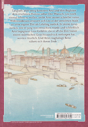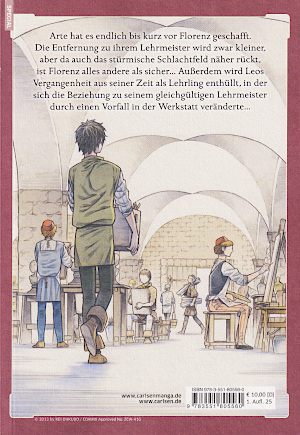 © 2014 Kei Ookubo Carlsen VerlagFlorenz, Anfang des 16. Jahrhunderts. Arte ist eine Tochter aus einem Spross der Adelsfamilie Spaletti. Als Frau darf sie eigentlich nur Hausarbeiten erledigen und ist dazu ausersehen, ihrem Mann später einmal Kinder zu gebären und den Haushalt zu führen. Doch Artes Vater lässt sie tun und machen, was sie will und unterstützt sie noch dabei. So hat sich Arte der Malerei verschrieben. Doch dann stirbt Artes Vater und die Mutter übernimmt das Kommando. Und sie ist nicht einverstanden mit Artes Malerei. So lässt sie alle Bilder von Arte verbrennen. Da sich herausstellt hat, dass Arte nur über eine kleine Mitgift verfügt, soll sie wenigstens die brave Hausfrau werden. So sieht Arte als einzigen Weg, sich ihre Unabhängigkeit zu sichern, einen Beruf zu lernen. Doch die Maler, bei denen sie sich als Lehrling bewirbt, lehnen sie von vorneherein ab. Denn eine Frau wird niemals ein Lehrling werden. Als Arte sich daraufhin wutentbrannt die Haare abschneidet und damit droht, sich zu verstümmeln, wird beschlossen, dass der Maler Leo sich um sie kümmern soll. Denn Leo hat derzeit keinen anderen Lehrling. Um Arte loszuwerden, gibt Leo ihr eine schwierige Aufgabe. Wider erwarten schafft sie diese Aufgabe und Leo stellt sie tatsächlich ein. So beginnt für Arte ein neues Leben. Denn sie muss aus ihrem reichen Haus ausziehen und in eine armselige Hütte auf dem Dach des Ateliers umziehen. Doch auch wenn sich Arte umstellen muss, gefällt ihr das neue Leben. Zumal sie dadurch neue Freunde kennen lernt. In dem Manga geht es um die Emanzipation einer Adligen, die beginnt, gegen den Willen der Mutter und der Gesellschaft ihren eigenen Weg zu gehen. In der Renaissance, der Zeit, in der viele berühmte Kunstwerke entstanden sind, gibt es viel Neues und zur damaligen Zeit auch Ungewöhnliches zu entdecken. So geht es in dem Manga auch um die Geschichte der Kunst in der damaligen Zeit. Grafisch ist der Manga dabei sehr gut. Die Charaktere sind sauber und abwechslungsreich gezeichnet. Die Gesichter sind zwar meistens etwas einfach gezeichnet, aber im Portrait können sie auch sehr detailliert sein. So können sie auch gut ihre Gefühle zeigen, wobei die Charaktere dafür auch ihren ganzen Körper einsetzen. Als Kleidung tragen die Charaktere meistens nur einfach Kleidung. Diese ist allerdings mehrlagig und detailliert gezeichnet. Und die Kleidung des Adels ist noch prächtiger. Wie die Kleidung sind auch die übrigen Gegenstände sehr sauber und präzise gezeichnet. Während die meisten Zeichnungen ihren eigenen Stil haben, sind die gezeigten Kunstwerke wie Renaissancewerke gezeichnet. Auch die Hintergründe sind sauber und detailliert gezeichnet. |