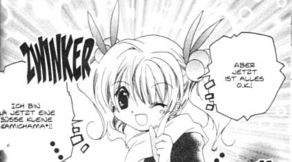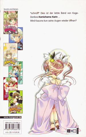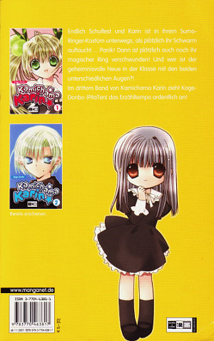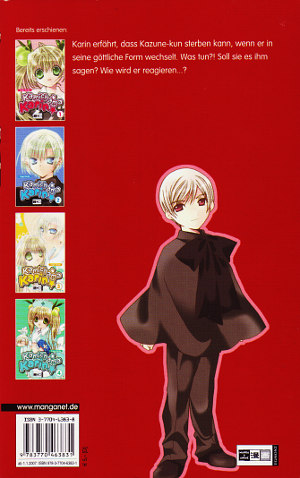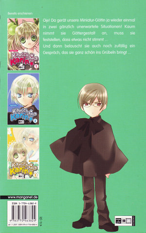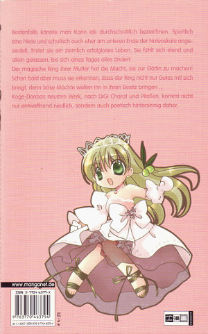 ![]() © 2003 Koge-Donbo Egmont MangaSeit ihre Eltern gestorben sind, lebt Karin bei ihrer Tante. Diese behandelt Karin eher als lästiges Anhängsel, was auch daran liegt, dass Karin in der Schule ziemlich schlecht ist. So ist Karins einziger Freund die Katze Shii-chan. Entsprechend niedergeschlagen ist Karin, als Shii-chan stirbt und sie ihn begraben muss. Doch an dessen Grab trifft sie eines Tages den ziemlich frechen Jungen Kazune. Karins Laune bessert sich kurz darauf wieder, als sie auch noch das Himeka kennenlernt, ein nettes Mädchen, dass ebenfalls keine Eltern mehr hat. Zu Karins Leidwesen stellt sich aber Kazune als Himekas Cousin heraus. Als sich Kazune für einen Ring interessiert, der das einige Andenken von Karin an ihre Mutter ist, geschieht ein Wunder. Karin wird plötzlich schnell, ihr gelingt alles in der Schule und sogar das Wetter scheint sich ihren Wünschen zu beugen. Noch während Karin darüber ganz verwirrt ist, trifft sie auf den geheimnisvollen Kirio Karasuma. Der will ihr den Ring abluchsen, doch bevor er dazu kommt geht, Kazune dazwischen. Kirio und Kazune duellieren sich. Als die inzwischen eingetroffene Himeka bedroht wird, verwandelt sich Karin in eine Göttin, um sie zu schützen. Wie Kazune, Himeka und auch Kirio es geahnt haben, ist Karin die Göttin Kamichama (-chama als Verniedlichungsform von -sama = göttlich). Allerdings sind Karins Kräfte noch nicht voll erwacht und die Gruppe um Kirio will alles tun, um dieses zu verhindern. Dagegen stemmt sich allerdings Kazune, der auch über einige Kräfte verfügt, und auch Himeka hilft Karin so gut sie kann. "Kamichama Karin" ist eine niedliche Magical-Girl-Serie. Am Anfang ist Karin deprimiert, wird aber durch ihre Verwandlung und Himekas Hilfe selbstbewusster und besser. Und natürlich dürfen die Gegner nicht fehlen. Grafisch ist der Manga nett gemacht. Besonders hervorstechend ist, dass Karin im normalen Leben recht einfach oder superdeformed gezeichnet wird, während sie als Göttin sehr sauber und extra niedlich ist. |