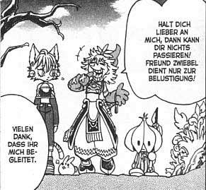 ![]() © 2000 Shiro Amano Egmont MangaToto ist der Held der Geschichte. Außerdem ist er ein Trottel, dessen einziges Streben der schönen Kistis Tulip gilt. Das einzige, was er kann ist kämpfen und dabei verkauft er sich unter Wert. Ein einziges handsigniertes Bild von Kistis reicht für ihn als Belohnung. Seine Gefährten dabei sind dabei eine lebende Zwiebel, die gestelzt daher kommt, ein kleiner Kaktus, den er leider ab und zu vernachlässigt und die Zwillinge Lisa und Bud, zwei junge Artefaktmagiere, die ihn fälschlicherweise für einen großen Lehrer halten. Obwohl Toto einfältig ist, wird er doch von geheimnisvollen Mächten als der Retter der Welt angesehen, soll er doch den alten Mana-Baum wieder erwecken. Leider kommt "Legend of Mana" etwas chaotisch daher. Das kommt durch die schnelle Abfolge der Geschichten, die anscheinend nichts miteinander zu tun haben. Dazu kommen den Geschichten entsprechend viele Charaktere vor. Das macht den Manga unruhig und schwerer zu durchschauen. Grafisch ist der Manga ansehnlich. Die handelnden Charaktere haben ein schönes Design. Allerdings werden die Hintergründe vernachlässigt. Nichts desto trotz hat der Manga seinen eigenen Charme und gewinnt durch die verschiedenen Charaktere (und durch Daena, das Catgirl). Der Manga ist eine Adaption des gleichnamigen japanischen Rollenspiels. |