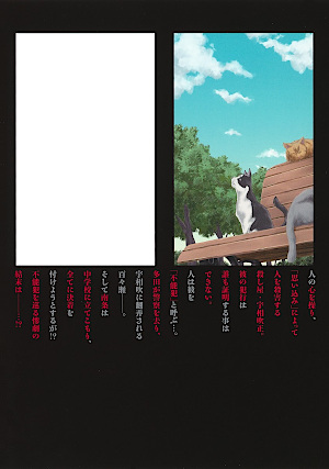 © 2014 Yuuya Kanzaki / Arata Miyatsuki TokyopopIn einem Café stirbt der Kredithai Kijima. Die Polizistin Yame soll den Fall untersuchen. Allerdings kann die Gerichtsmedizin weder Gift noch Wunden an Kijima feststellen. Auf den Überwachungsvideos sieht Yame, dass sich Kijima in dem Café mit dem Herumtreiber Tadashi Usobuki getroffen hat. Sie findet ihn im Park inmitten einer Schar von Katzen und will ihn zur Rede stellen. Doch er bittet sie, seine Katzen zu füttern. Als sie dem nachkommt, wird sie aber von einer der Katzen am Arm gekratzt. Usobuki nutzt die Gelegenheit, die blutende Wunde abzulecken. Doch kurz darauf ist der Arm so stark geschwollen, dass sich Yame darum kümmern muss. Usobuki kann so entkommen. Der Arzt, der Yame untersucht, kann allerdings an ihrem Arm nichts auffälliges feststellen. Er findet zwar Usobukis Speichel, aber kein Gift, dass diese Schwellung verursacht haben könnte. Yames Kollege Katsumura vermutet, dass Usobuki durch Suggestion gemordet haben könnte. Für Katsumura ist Usobuki ein unaufspürbarer Mörder, der töten kann, ohne Spuren zu hinterlassen. Allerdings reizt er Yame sehr, da sie seinen Sohn in einem Fall so beschuldigt hat, dass er sich umgebracht hatte. Und Katsumura gibt Yame die Schuld dafür. Yame will es wissen und trifft sich alleine mit Usobuki. Doch er sagt ihr, dass sie in der Nacht sterben wird und tatsächlich ist sie am Morgen tot. So bekommt Katsumura ihren Fall. Doch den hat er auch nicht lange. In nächsten Fall geht es um zwei Zwillingsschwestern, die als Kinder getrennt worden sind. Während es der einen Schwester gut geht, ist die andere Schwester heruntergekommen. Als sie von der bevorstehenden Hochzeit ihre Schwester hört, will sie ihr das Glück nicht gönnen. So verlangt sie von Usobuki, ihre Schwester zu töten. In dem Manga geht es um einen Massenmörder, der ohne Spuren zu hinterlassen tötet. Dabei werden die Fälle aus der Sicht der Opfer erzählt, wie Usobuki seine Spielchen mit ihnen treibt und wie sie sterben. So scheinen sie meistens ohne Fremdeinwirkung zu sterben. Aber auch wenn es sich anscheinend um Morde handelt, ist der Manga eher ein Horrormanga. Zumal die Auftraggeber ebenfalls am Ende tot sind. Grafisch ist der Manga in Ordnung. Die Charaktere sind sauber gestaltet und unterschiedlich gezeichnet. Die Frisuren sind etwas einfach, aber auch detailliert gestaltet. Die Gesichter sind gut, aber mit einigen Falten auch übertrieben gezeichnet. Dieses gilt auch für die Emotionen. Die Kleidung besteht aus Freizeitkleidung und Anzügen. Diese sind aber eher einfach gezeichnet. Die Tiere, Katzen und Insekten, sind sehr sauber und detailreich umgesetzt. Auch die Gegenstände sind sauber und ordentlich gestaltet. Die Hintergründe sind ebenfalls sauber umgesetzt. |