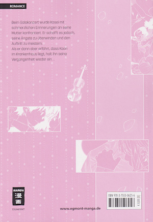 © 2011 Naoshi Arakawa Egmont MangaDie Mutter des als Wunderkind gefeierten Kosei Arima starb, als er 11 Jahre alt war. Da sie es war, die ihn zum Klavier spielen trieb, hatte er danach Probleme mit seinem Klavierspiel, weswegen er komplett damit aufgehört hat. Koseis einziger Halt ist seine Sandkastenfreundin Tsubaki aus dem Nachbarhaus. Sie unterstützt ihn, auch wenn ihre Bälle aus dem Sportunterricht oft den Weg an seinen Kopf fanden. Aber seit er sie getroffen hat, spürte er das erste Mal nach dem Tod seiner Mutter wieder etwas Farbe in sein Leben. Eines Tages schlägt Tsubaki aber ein gemeinsames Treffen mit Ryota Watari vor. Ryota ist ein Frauenheld und Tsubaki soll ihm ihre Klassenkameradin Kaori Miyazono vorstellen. Damit Tsubaki dann nicht alleine ist, soll Kosei sie begleiten. Außerdem spielt die Klassenkameradin Geige und da er Klavier spielt, sollte er sich gut mit ihr verstehen. Als Kosei allerdings am nächsten zum Treffpunkt kommt, ist noch niemand da. Da fällt ihm ein Frauenschuh im Gebüsch auf und als er weiter nachschaut, findet er nicht nur den zweiten Schuh, sondern auch eine Frauenleggings. Kurz darauf sieht er ein junges Mädchen auf dem Spielplatz, dass eine Melodica spielt. Sie tanzt dazu mit nackten Beinen auf einer Spielhöhle. Kosei ist hingerissen von ihr. Er will sie fotografieren, zumal sie zusammen mit anderen Kindern musiziert. Doch als sie stürzt, wird sein Foto etwas peinlich. Aber auch wenn Kosei sich so in Kaori verliebt hat und Kaori ihn toll findet, da er Klavier spielt, scheint sie Ryota mehr zu mögen. Aber das Treffen dauert auch nur kurz, da sie in der nahen Towa Hall einen Auftritt als Violinisten hat. Als sie in der Halle eintreffen, wird Kosei aber als das Wunderkind erkannt, der er einmal war. In dem Manga geht es um eine etwas verwirrende Liebesgeschichte zwischen einer Violinisten und einem Klavierspieler. Aber Kaori muss ihm erst die Liebe zur Musik wieder beibringen, denn Kosei kann sein eigenes Klavierspiel nicht mehr hören. Grafisch ist der Manga sehr gelungen. Die Charaktere sind teilweise etwas schräg, aber dennoch sauber und abwechslungsreich gezeichnet. Die Frisuren sind gut getroffen und unterschiedlich dargestellt. Die Gesichter sind allerdings teilweise einfach gestaltet. Aber teilweise sind sie auch sehr fein gezeichnet und können gut die Gefühle darstellen. Als Kleidung tragen die Charaktere oft die Schuluniformen. Aber auch andere Freizeitkleidung wird getragen. Sie passt mit den Falten gut zu den Posen und dynamischen Bewegungen der Charaktere. Gegenstände wie die Musikinstrumente sind sehr sauber und ordentlich gezeichnet. Tiere hingegen sind einfach gestaltet. Die Hintergründe sind wiederum detailreich und sauber dargestellt. |