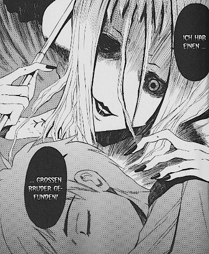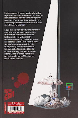 © 2010 Haruto Ryo Manga CultDer Design-Student Kazuki Ito ist genervt. Seine kleine Schwester Hikari ruft extra bei ihm an, damit er noch abends den Müll raus bringt. Als er am Müllplatz ankommt, bemerkt er dort ein seltsames Mädchen. Sie ist gekleidet wie eine Gothic Lolita. Unter ihr läuft eine seltsame Flüssigkeit aus und ihr Arm sieht aus, als hätte sie Fäden in ihre Haut eingenäht. Kazuki beschließt, sie zu ignorieren. Aber als er seinen Müll ablegt, hört er in dumpfer Stimme die Frage, ob er eine kleine Schwester hat, die er unbewusst beantwortet. Weil ihm alles seltsam vorkommt, läuft er nach Hause. Als er sich dort umdreht, ist das seltsame Mädchen weg. Doch als Kazuki ein paar Tage später wieder den Müll hinausbringen will, sitzt das Mädchen dort wieder herum. Als er versucht, den Müll von hinten auf dem Haufen zu platzieren, steht sie abrupt auf und ihr Stofftier fällt hin. So beschuldigt sie Kazuki, ihren „Keiichi“ schmutzig gemacht zu haben. Als Kazuki in seine Wohnung kommt, drängt sie sich ungefragt hinein. Weil Kazuki angeblich ihr Stofftier schmutzig gemacht hat, beginnt sie, es in seiner Spüle zu säubern. Dabei spritzt eine Menge stinkender Flüssigkeit herum, weshalb er danach noch einige Zeit seine Wohnung säubern muss. Allerdings hört Kazuki zufällig von einer Urban Legend, wonach eine seltsame Gothic Lolita eine einfache Frage stellt. Beantwortet man diese, dringt sie in das Leben ein und benimmt sich als „kleine Schwester“. Und schließlich stirbt man an einem schrecklichen Tod. Kurz darauf ist Kazukis Wohnung aufgeräumt, als er nach Hause kommt. Er vermutet, dass Hikari sich um ihn gekümmert hat. Doch als Hikari Kazuki besucht, bestreitet diese, in seiner Wohnung gewesen zu sein. Von der Hausmeisterin erfährt er aber, dass seine kleine Schwester sich den Wohnungsschlüssel ausgeliehen hat, da sie den ihren vergessen hat. Nur dass diese Schwester ein Gothic Lolita-Kostüm trug. Die Serie handelt von verschiedenen Urban Legends, die für die Beteiligen tödlich enden. Meistens fängt es harmlos an, aber dann wird es schnell brutal und blutig. Etwas ärgerlich ist es, dass der Leser es teilweise schwer hat zu erkennen, wenn eine neue Urban Legend beginnt. Grafisch ist der Manga sehr gelungen. Die Charaktere sind sauber und unterschiedlich gestaltet. Die Frisuren sind meistens eher einfach gestaltet, nur einige Mädchen haben längeres detailliert gezeichnetes Haar. Die Gesichter sind teilweise einfach, teilweise aber auch detaillierter gestaltet. So sind die Emotionen auch fein umgesetzt. Die Gothic Lolita hat neben einem schrägen Lächeln auch seltsame dunkle Augen. Die normalen Menschen tragen einfache Freizeitkleidung oder Schuluniformen. Diese sind sauber gestaltet und passen gut zu den Posen. Besonders bei den Schülerinnen ist sie teilweise sehr figurbetont umgesetzt. Das Kleid der Gothic Lolita ist dagegen sehr detailliert gezeichnet. Allerdings ist es auch sehr schmutzig, so dass einige der Muster verschwimmen. Die Gegenstände werden ebenfalls sauber und detailreich dargestellt. Entsprechend dem Horrorgenre gibt es auch einige blutige Szenen, die auch in das Splatterartige abgleiten. Teilweise ist aber auch Flüssigkeit zu sehen, die Schwarzweiß wie Blut aussieht, aber nach der Reaktion der Beteiligten kein Blut sein kann. Die Hintergründe sind detailliert gezeichnet und gut der jeweiligen Stimmung angepasst. |