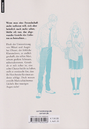 © 2022 Rumi Ichinohe Carlsen VerlagDie Schülerin Hikari Mori hält sich für durchschnittlich. Sowohl in der Schule als auch im Sport sind ihre Leistungen nicht überragend, aber auch nicht schlecht. Der einzige Pluspunkt in ihrem Leben ist ihre Freundin Mari Takahashi, mit der sie seit der Grundschule befreundet ist. Mari sieht gut aus, ist aber viel zu schüchtern für eine Beziehung mit einem Jungen. Hikari und Mari lieben beide Shojo-Mangas und -Geschichten. Während Mari in ihnen aufgeht, findet die analytische Hikari aber immer etwas, was ihr missfällt. Aber sie würde selber gerne Geschichten schreiben, aber sie kann nicht zeichnen. Da Mari hübsch, aber zu schüchtern ist, sich mit einem ihrer Verehrer einzulassen, überlegt Hikari für sie, mit welchem Junge sie zusammen passen würde. Shintaro Ohtani, der vor Hikari sitzt, kommt als beliebter und ausdrucksstarker Schüler für Mari in Betracht. Auch Sano Asagiri, der ständig mit Ohtani zusammen ist, sieht gut aus. So ist er wahrscheinlich der begehrteste Junge der Klasse. Aber er ist auch ein Playboy und fällt damit aus. So beschließt Hikari, Mari und Ohtani miteinander zu verkuppeln. Sie selbst will bei dieser Liebesgeschichte nur die Rolle der Freundin spielen. Zwar scheint Hikaris Plan zunächst aufzugehen. Doch plötzlich will Ohtani lieber mit ihr als mit Mari reden. Und während Hikari versucht, Ohtani davon zu überzeugen, dass Mari für ihn die perfekte Freundin ist, bemerkt sie nicht, dass Mari sich anscheinend gut mit Asagiri unterhält. Der Manga erzählt von einer Liebesgeschichte zwischen Schülern. Sie wird allerdings kompliziert, als sich die falschen Schüler füreinander interessieren. Und das, obwohl sich Hikari alle Mühe gibt, ihren Traum vom perfekten Paar zu erfüllen. Grafisch ist der Manga sehr gut. Die Charaktere sind sauber gezeichnet. Die Mädchen sind unterschiedlich gezeichnet, während die Jungs sich sehr ähneln. Die Frisuren sind sehr detailliert gezeichnet. Auch die Gesichter unterscheiden sich leicht und zeigen gute Gefühle. Als Kleidung tragen die Charaktere einfache Schuluniformen oder Sportkleidung. Asagiri unterscheidet sich von Ohtani, indem er ständig die Blazerjacke trägt. Die Kleidung ist aber mit Falten gut an die Körperhaltung angepasst. Gegenstände wie Hikaris Horn und andere Musikinstrumente, sowie Schokoriegel sind sauber und detailreich gezeichnet. Es gibt nur wenige Hintergründe, die sauber gestaltet sind. |