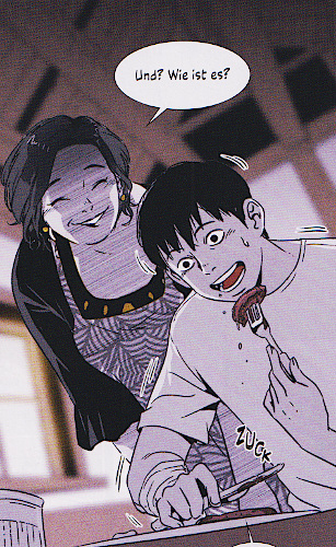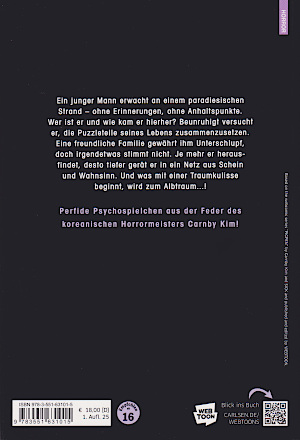![]() © 2019 Cheon Beomsik / Carnby Kim C LinesEin Mann wacht ohne Gedächtnis an einem Strand auf. Schnell stellt er fest, dass er sich auf einer Insel befindet. Doch glücklicherweise scheint die Insel bewohnt zu sein, denn Nachts sieht er in der Ferne ein großes, beleuchtetes Haus stehen. Tatsächlich wacht er dort am nächsten Morgen auf. Die älteste Tochter, Romi, hat ihn gefunden und ins Haus gebracht. Da er sein Gedächtnis verloren hat, wird er von der Mutter gepflegt. Überhaupt scheint ihn die Familie gut aufzunehmen, was sie damit erklären, dass sie eigentlich ein Gasthaus sind. Wobei sich der Mann fragt, wie so ein großes Gasthaus auf einer einsamen Insel überleben kann. Allerdings weichen die Familienangehörigen seiner Frage, wo er sich genau befindet, mehr oder weniger gut aus. Aber immerhin ist das Essen gut, denn die Mutter ist eine ausgezeichnete Köchin. Der Mann ist allerdings entsetzt, als er hört, dass die jüngste Tochter Romi das Schwein geschlachtet haben soll. Da dem Mann die ganze Situation allerdings verdächtig vorkommt, kann er nicht schlafen. So kann er nachts nicht schlafen und beobachten den Sohn Minu, wie er mit einem Mann, den er bislang nicht auf der Insel gesehen hat. Bald weiß der Mann nicht mehr, was er denken soll. Manchmal sind die Bewohner nett und freundlich, aber dann bedrohen sie ihn wieder sein Leben. Ständig tauchen auch nachts Menschen auf, die er tagsüber nicht sieht. Und immer wenn er denkt, dass er von der Insel fliehen kann, kommt wieder etwas dazwischen. Der Manhwa ist ein Horrorcomic, bei dem ein Mann an eine seltsame Familie gerät. Er spürt schnell, dass etwas nicht stimmt. Aber man lässt ihn nicht in Ruhe, damit er nachdenken kann. Immer wieder gibt es ebenso überraschende wie bizarre Wendungen. Wobei der Leser nicht mehr erfährt als der Mann. Grafisch ist der Manhwa in gelungen. Die Charaktere sind sauber und abwechslungsreich, aber auch etwas überzeichnet gestaltet. Die Frisuren sind individuell gezeichnet und auch die Gesichter sind unterschiedlich gestaltet. So werden auch die Emotionen ordentlich, aber teilweise auch übertrieben dargestellt. Die Kleidung ist einfach gestaltet. Die meisten männlichen Charaktere tragen nur einfache Hemden. Nur der Vater trägt ständig einen Priesteranzug. Die Kleidung der Frauen ist individueller gestaltet. Die Mutter trägt die einfachen Kleider einer älteren Hausfrau, Romi trägt die erotische Kleidung eines Goth-Girls und Romi eine Matrosenuniform. Die Gegenstände sind sauber und ordentlich umgesetzt. Die Hintergründe sind sauber und detailliert gezeichnet. Die Panels sind leicht farbig, wobei bei einzelnen Panels oft nur eine Farbe dominiert. |